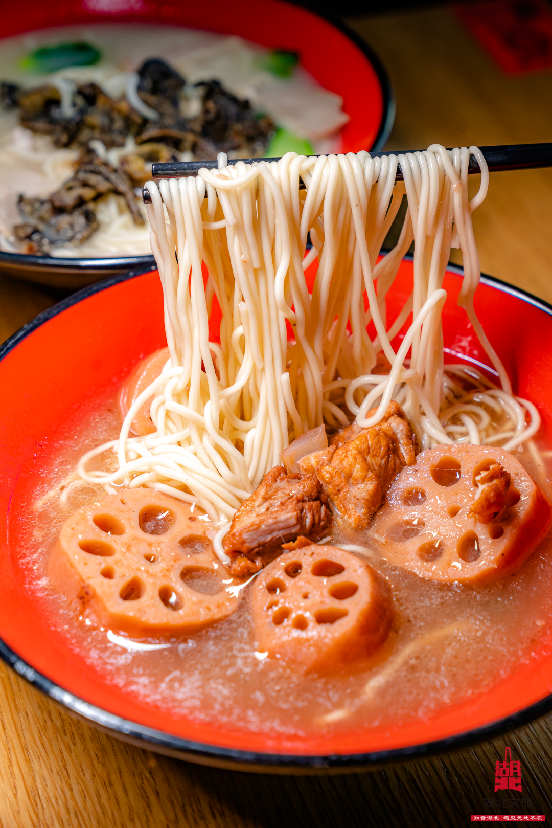藕汤排骨面,精选湖北本地莲藕,粉糯清甜,与鲜嫩排骨慢火熬制,汤底浓郁醇厚,鲜得眉毛都要掉下来。每一根面条都吸饱了藕汤的精华,入口爽滑劲道,满满的都是家的味道。