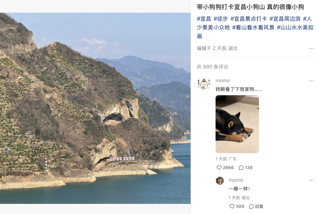 近期有网友在秭归旅游的时候发现长江岸边一座小山的轮廓很像一只乖乖趴着的小狗湖北文旅抖音、视频号转发后引发了全网的热烈关注
