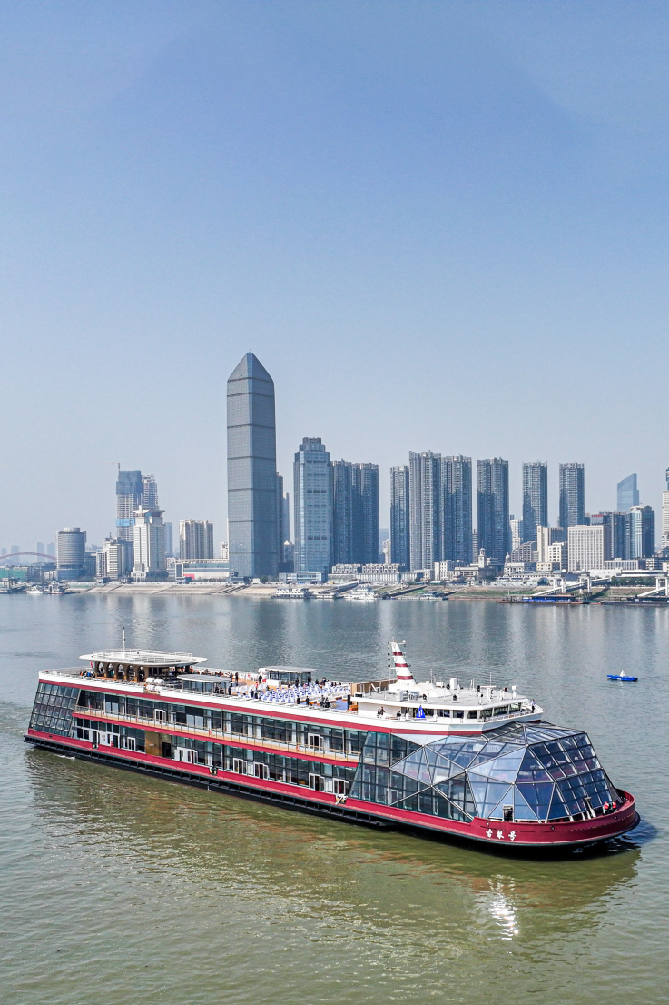 它是全长118米、型宽21.8米、近万吨重的“大块头”。一层大厅、二层包厢、顶层甲板,加起来5000平方米,单层相当于半个足球场,堪称武汉江上最豪华游轮。