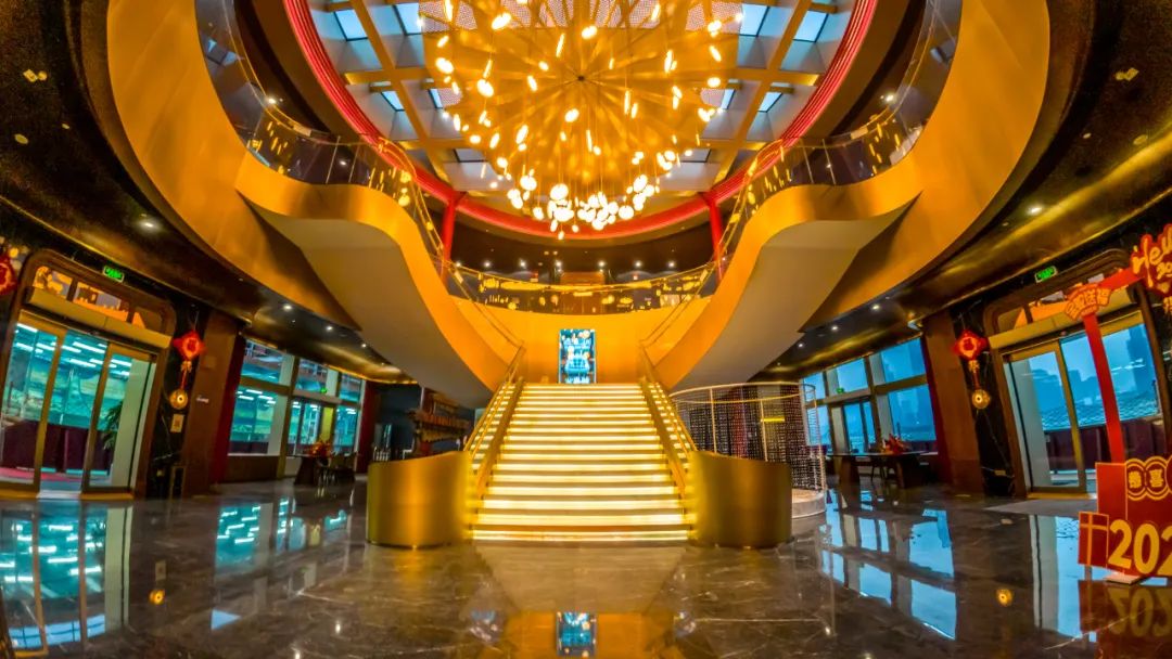 窗外,两岸的长江灯光秀如巨幕电影播映,随手一拍满满氛围感。室内,无柱式设计让视野毫无遮挡,大厅中央的旋转楼梯气场强大,垂落的水晶吊灯华丽夺目,富有创意的霓虹灯箱纵深感十足。