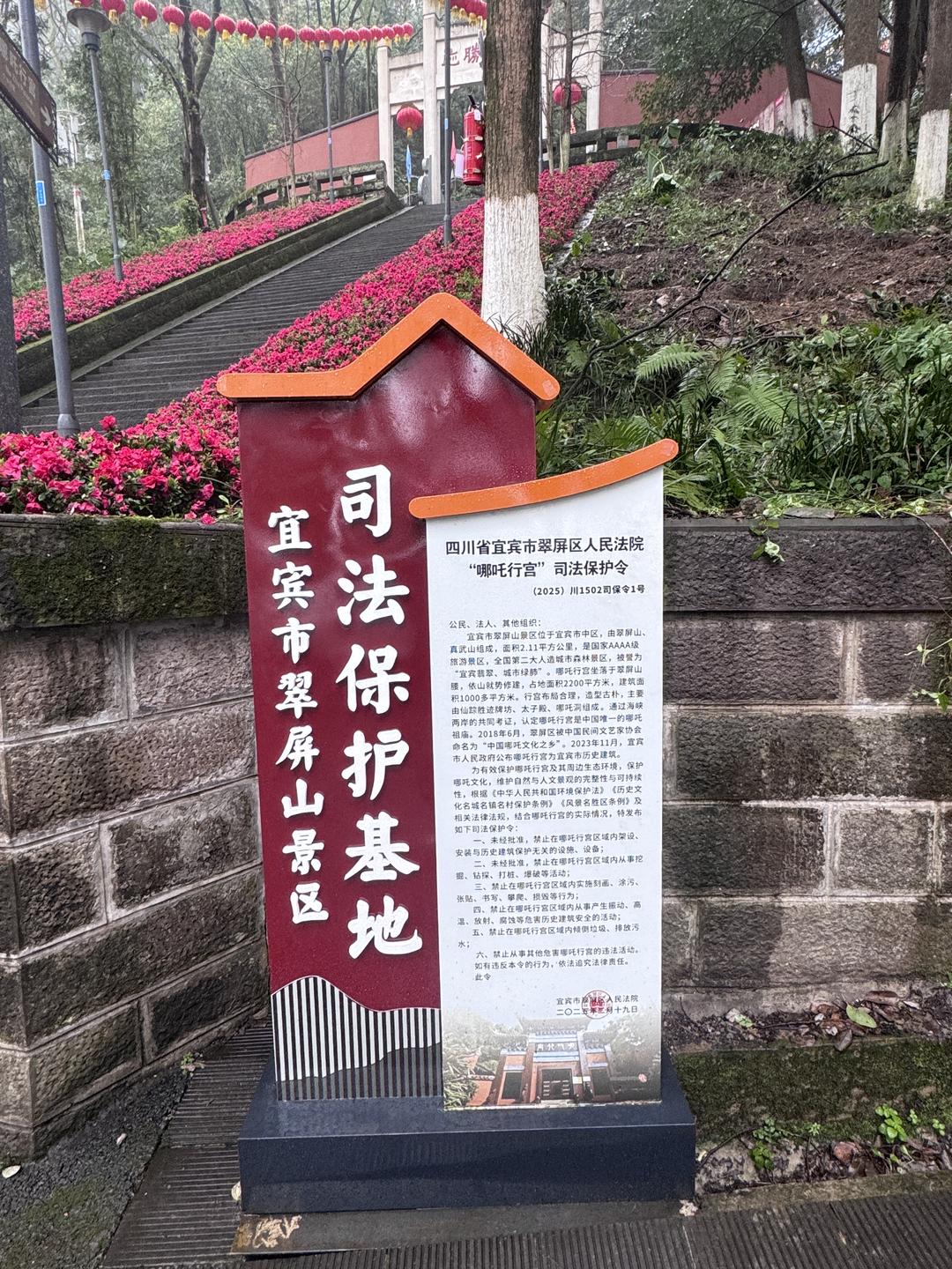 2月21日,红星新闻记者注意到,在“哪吒行宫”山门石梯下的公路边,新增了一块“宜宾市翠屏山景区司法保护基地”的牌子,上面印有“(2025)川1502司保令1号——《四川省宜宾市翠屏区人民法院“哪吒行宫”司法保护令》。”这也是今年宜宾法院系统发布的首份司法保护令。