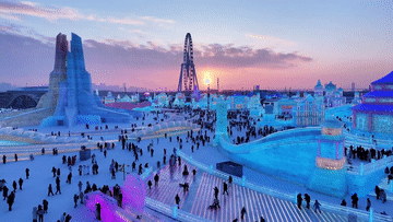 作为世界知名的冰雪主题乐园,哈尔滨冰雪大世界是我国冬季旅游的特色名片。本届园区以“冰雪同梦,亚洲同心”为主题,充分融入亚冬会元素。白天晶莹剔透,夜幕下流转生辉,500多米长的超级冰滑梯,散落各处的20多条小滑梯,多条雪圈滑道,抽冰嘎、冰上自行车等娱乐项目,带领游客感受冰雪的极致快乐。