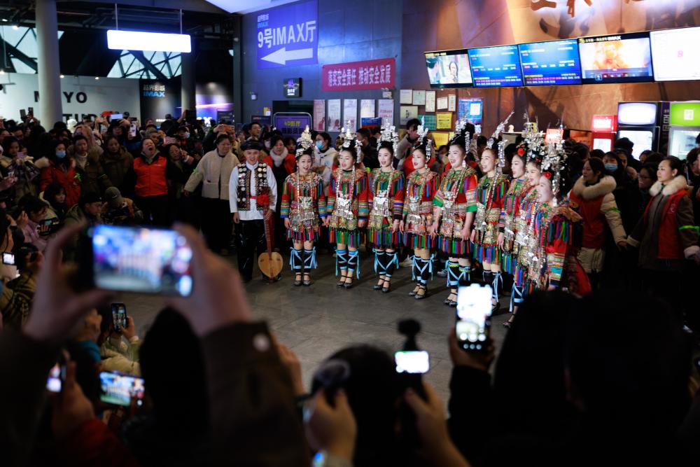 2月25日,演员在贵阳越界影城表演侗族大歌。新华社记者 刘续 摄