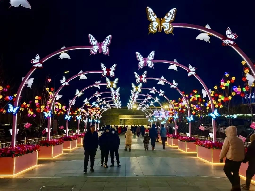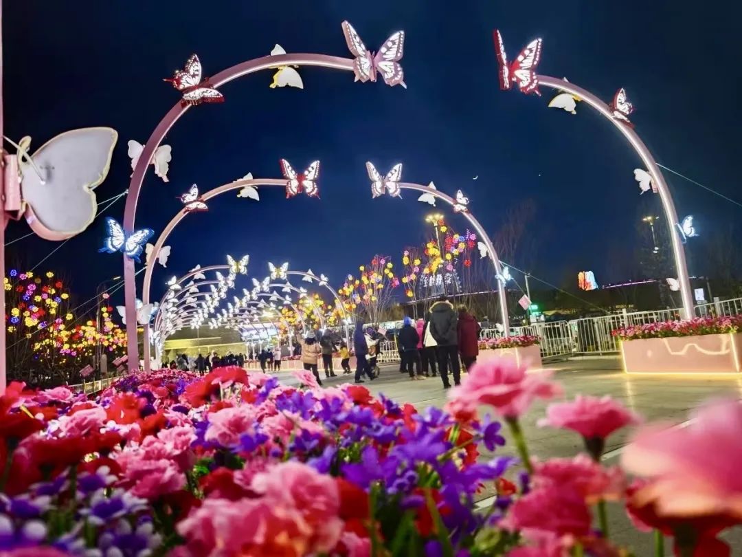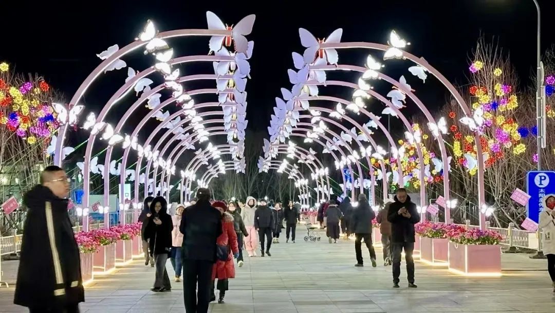 从地铁2号线冰雪大世界站3号口出来,便能见到这条梦幻般的蝴蝶长廊。长廊的设计独具匠心,拱形的支架上装饰着蝴蝶翩翩起舞的灯具,让人如同置身于一个美丽的蝴蝶王国。白天拍摄蝴蝶长廊,阳光透过拱形支架,洒在色彩斑斓的蝴蝶灯饰上,宛如一条梦幻的彩带。入夜,蝴蝶长廊则换上了迷人的晚装。无人机腾空而起,俯瞰之下,灯光璀璨的长廊如同一条流光溢彩的银河,蝴蝶灯饰在夜空中闪烁,更添了一份神秘与浪漫。