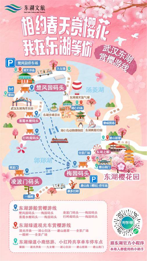 东湖樱花园与日本青森县弘前樱花园、美国华盛顿州樱花园并称为世界三大樱花之都。樱花园位于磨山南麓,始建于1998年,占地面积520亩,有五重塔、曲院樱艳、湖中岛、虹桥等著名标志性景观。