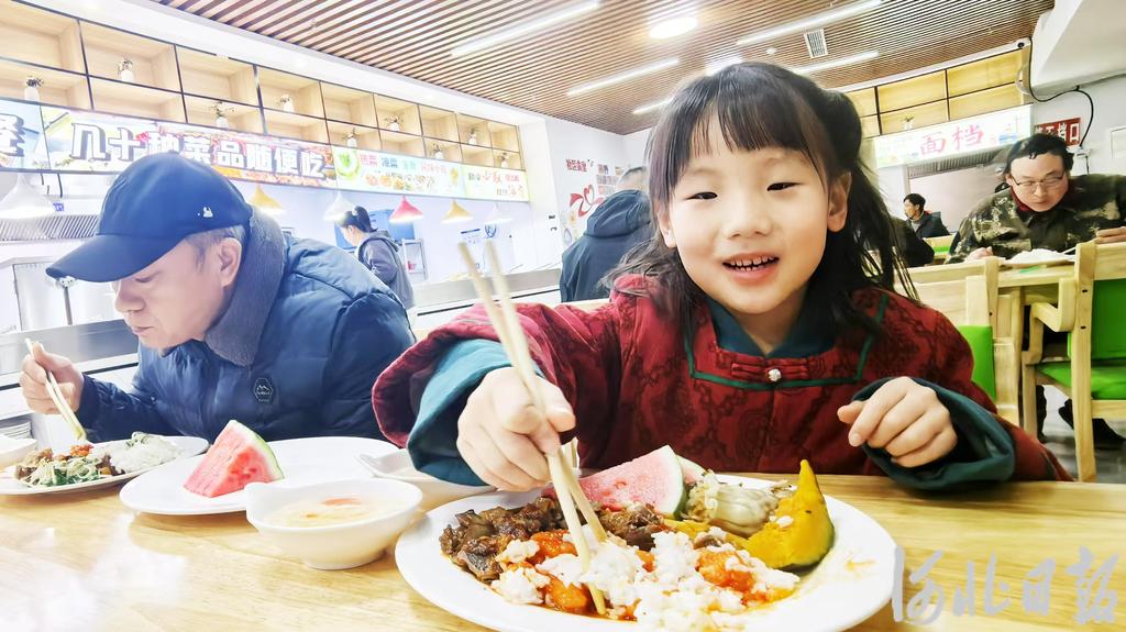 2024年11月19日,雄安新区容东片区罗河社区食堂,家住富兴园社区的李思柔(右)跟家人一起就餐。河北日报记者刘光昱摄