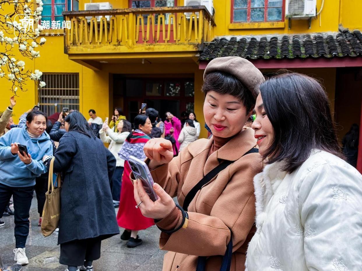 “老感觉角度不对劲,人太多了,下面老是有手出现。”市民刘阿姨是摄影爱好者,她用三脚架固定好相机,在玉兰周边已经找了一圈的角度。