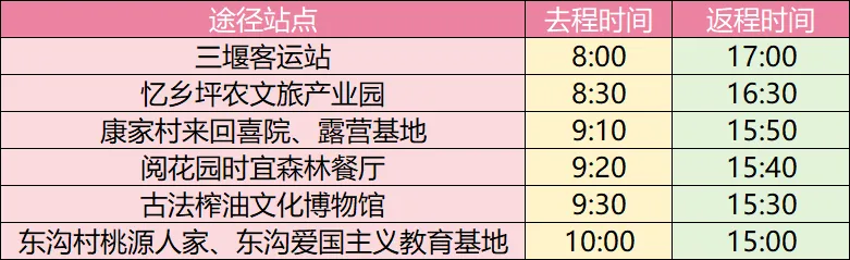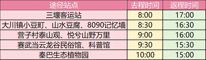 据悉,直通车分为两条线路,串联起秦巴生态植物园、东沟爱国主义教育基地、忆乡坪农文旅产业园、康家村露营基地、阅花园时宜森林餐厅、东沟村桃源人家、大川镇小豆町、营子村泰山观、赛武当云龙谷民俗馆和科普馆等景点。每周六、日上午8点从三堰客运站发车,广大市民和外地游客均可免费乘坐。