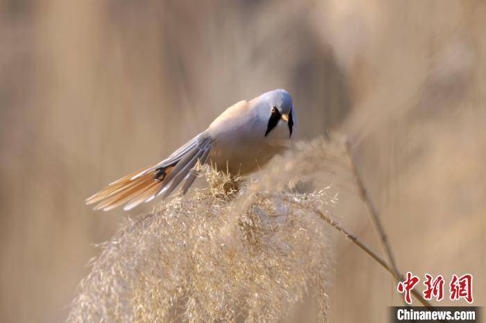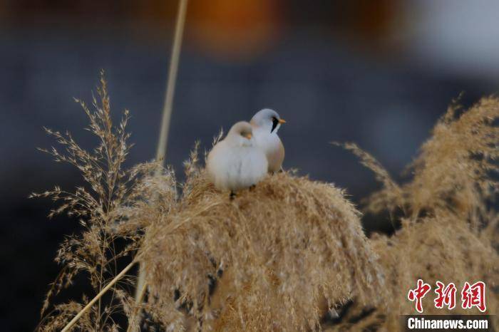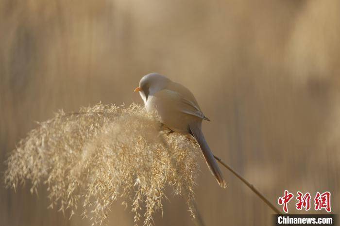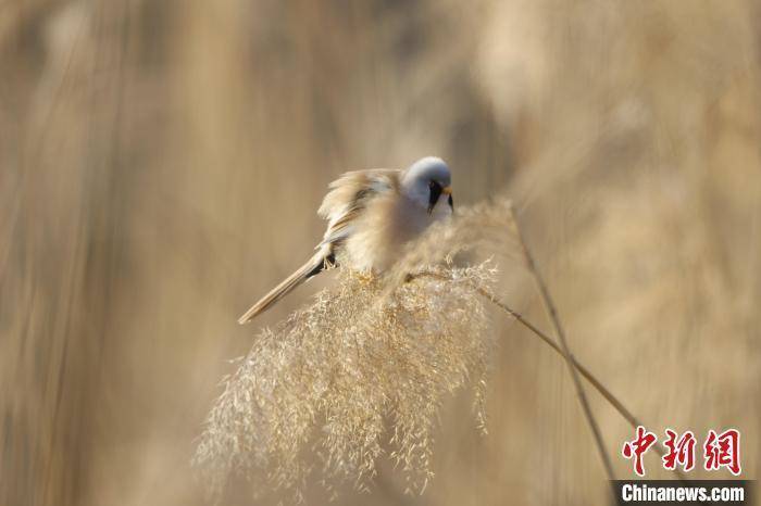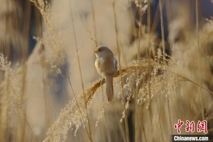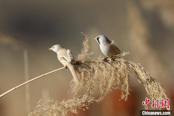 近日,河南省三门峡市动物保护机构开展日常监测时发现,一群文须雀现身黄河湿地,这是当地首次发现该鸟类物种。文须雀雌鸟为黄褐色,雄鸟头部呈灰色,面部有独特的黑色髭纹。文须雀主要栖息在湿地水塘边的芦苇丛或树丛间,因飞行快速,行动敏捷,有鸟类“体操王子”之誉。张明云摄