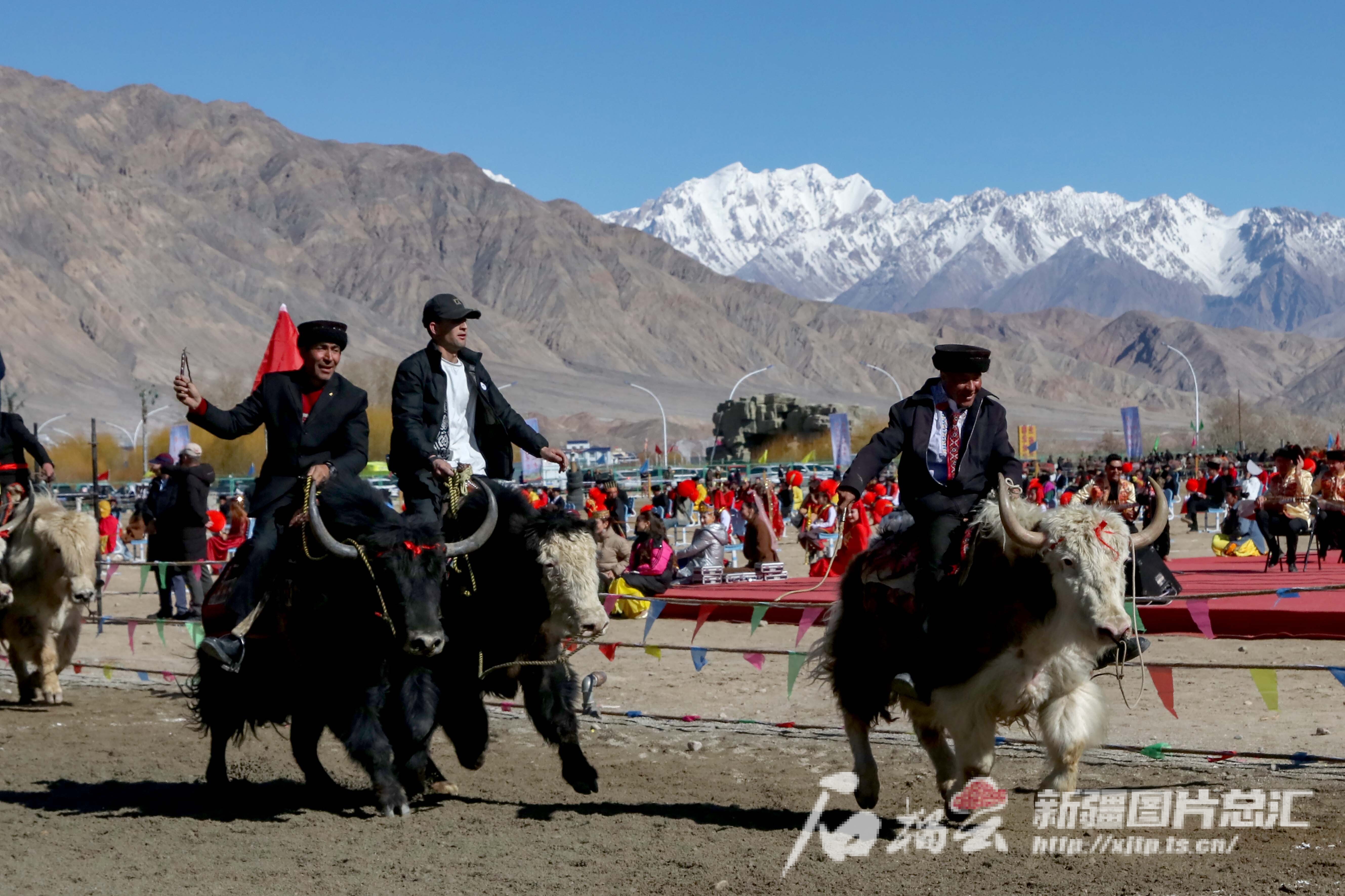 3月23日,牧民在塔什库尔干塔吉克自治县非物质文化遗产展示园(提孜那甫乡赛马场)表演骑牦牛比赛。