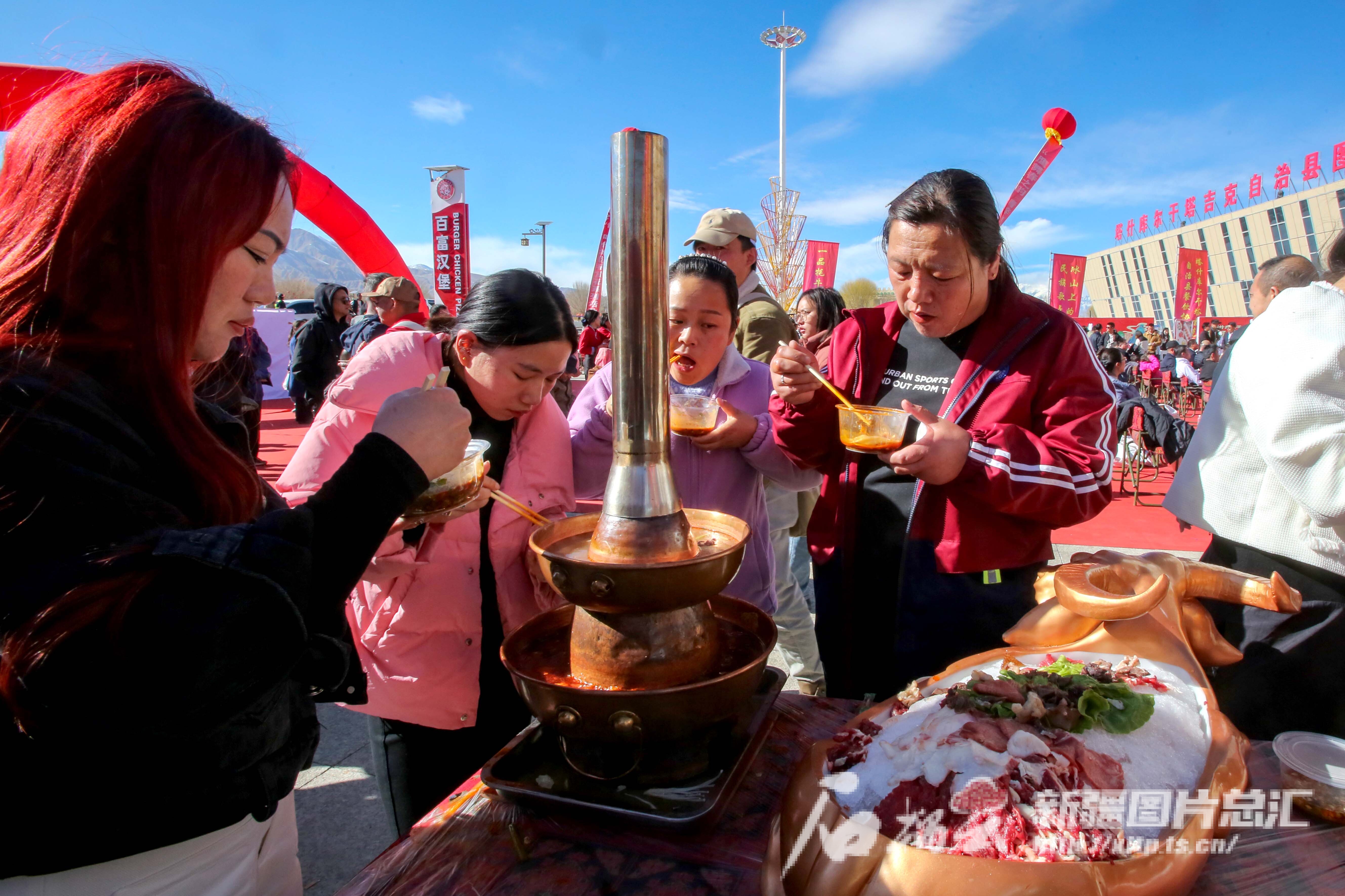 3月23日,游客在塔什库尔干塔吉克自治县奇石广场的火锅比赛中品尝牦牛肉火锅。