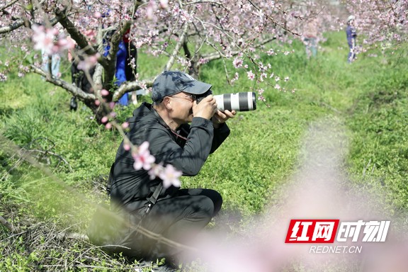 摄影爱好者蹲在桃林,专注地举起相机,准备定格桃花盛开的美妙瞬间。