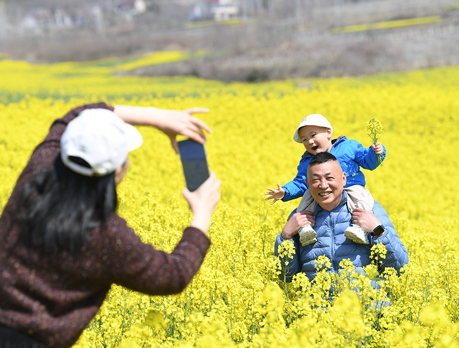 3月19日,游客在安徽省巢湖市夏阁镇里岗村千亩油菜花田赏花拍照。 新华社发(马丰成摄)