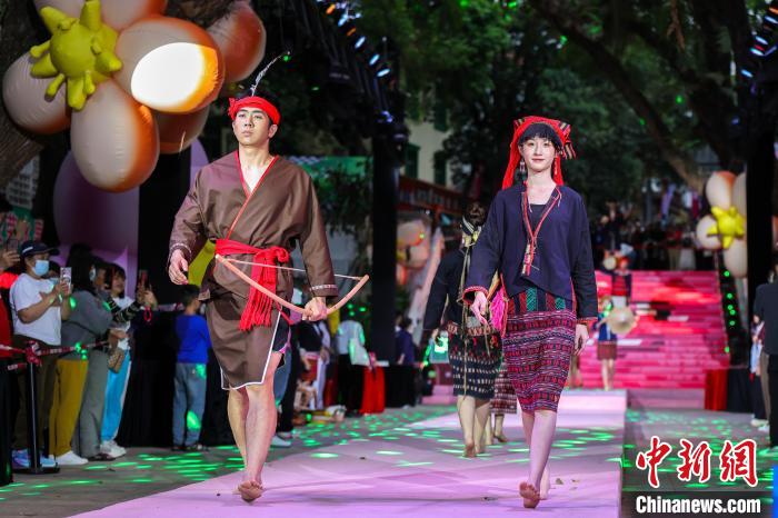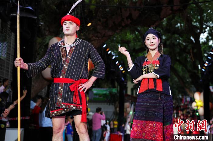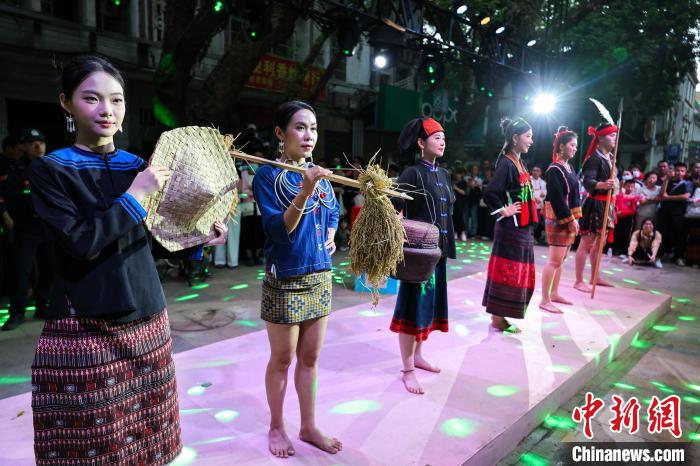 3月31日,正值中国农历“三月三”,海南省五指山市鸿鑫农贸市场一场民族时装“村秀”精彩上演。模特身着黎锦、苗绣与现代设计融合的服饰,手持农具登台走秀,展现传统农耕文化与民族服饰的魅力。 中新社记者骆云飞摄