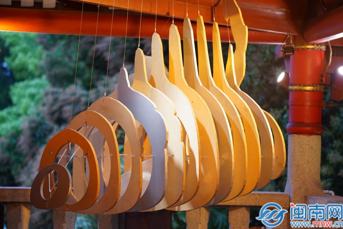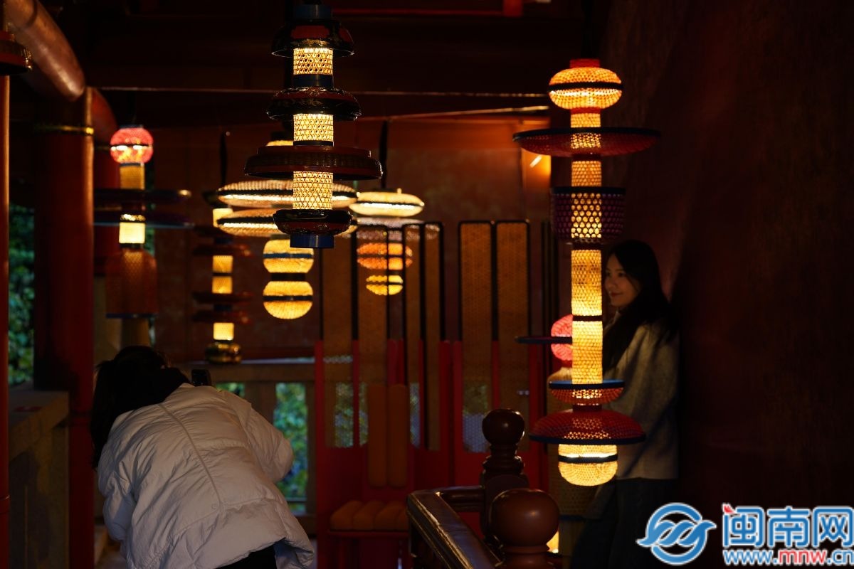春雨绵绵,华灯初上,作为古城地标性建筑之一的威远楼流光溢彩。走进前广场,翠角方榭、四角明亭、风骨船坊、前院游廊等营造恬静、舒适的艺术氛围。从广场到楼宇内部,从一楼到二楼,在上城士打造的非遗空间里,不同艺术家的展区令人目不暇接:以泉州传统建筑“滴水兽”为灵感创作的《滴水木兽》,通过木片结构和3D打印技术,为观众送上“遇水则发”的美好寓意;演员黄轩以泉州中山公园的“百年神树”为灵感,用松木实木、金属丝等材料,构筑出一座悬挂的“线性神树”,枝桠间醒狮骨架轻盈悬挂,展现传统与现代的碰撞;李林妲的《灵之神树》营造出神秘诗意的氛围,李宛妲的《心之神树》则运用新媒体互动技术,给观众带来别样体验……