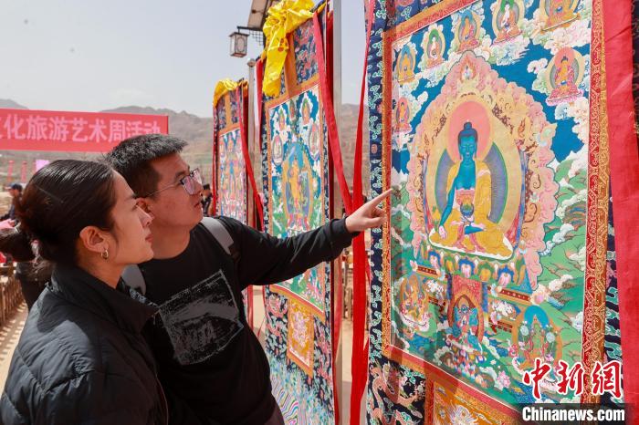 图为游客正在观赏化隆唐卡。薛蒂摄
