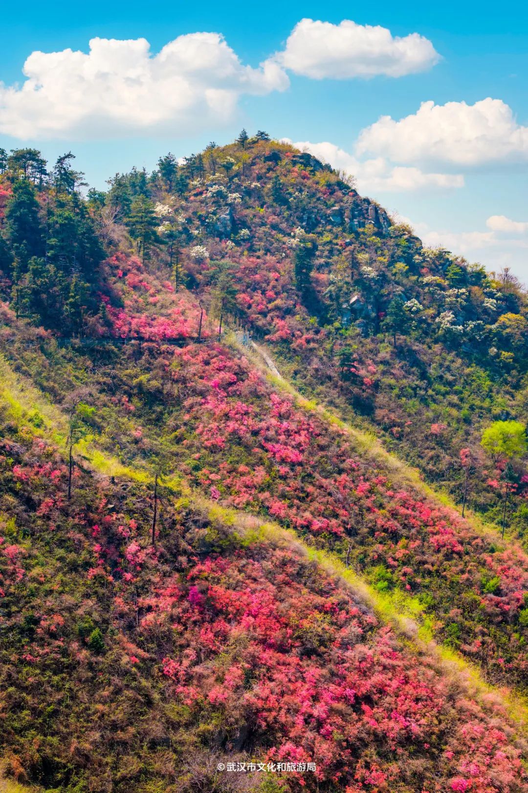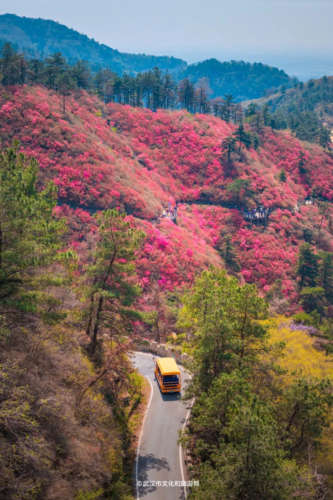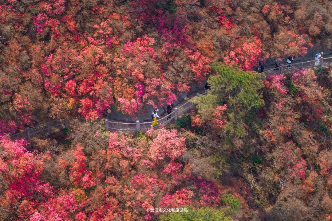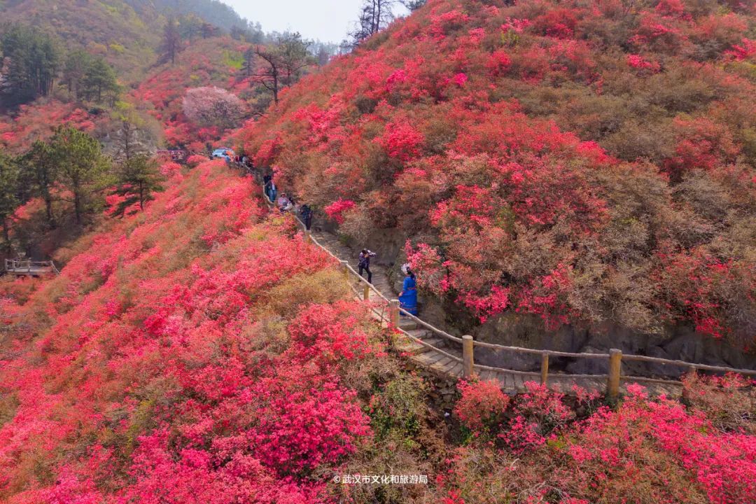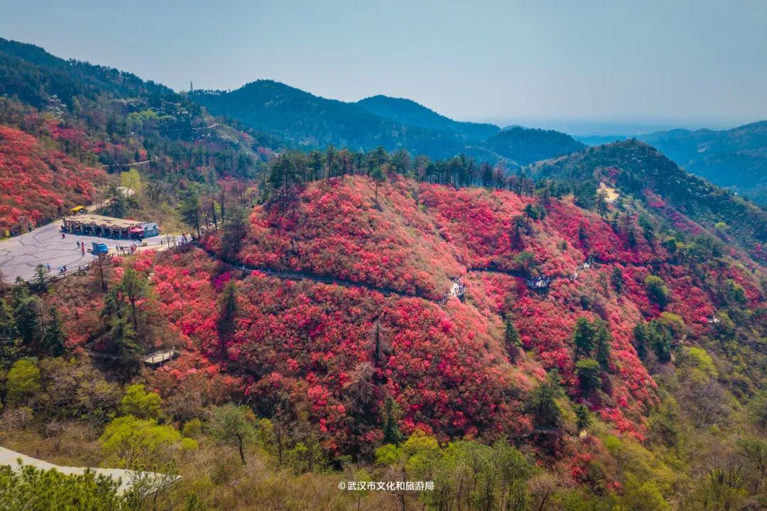 木兰云雾山位于武汉市黄陂区西北部,属大别山余脉,野生杜鹃花铺满3座山,因海拔不同,花开时间也不一样。