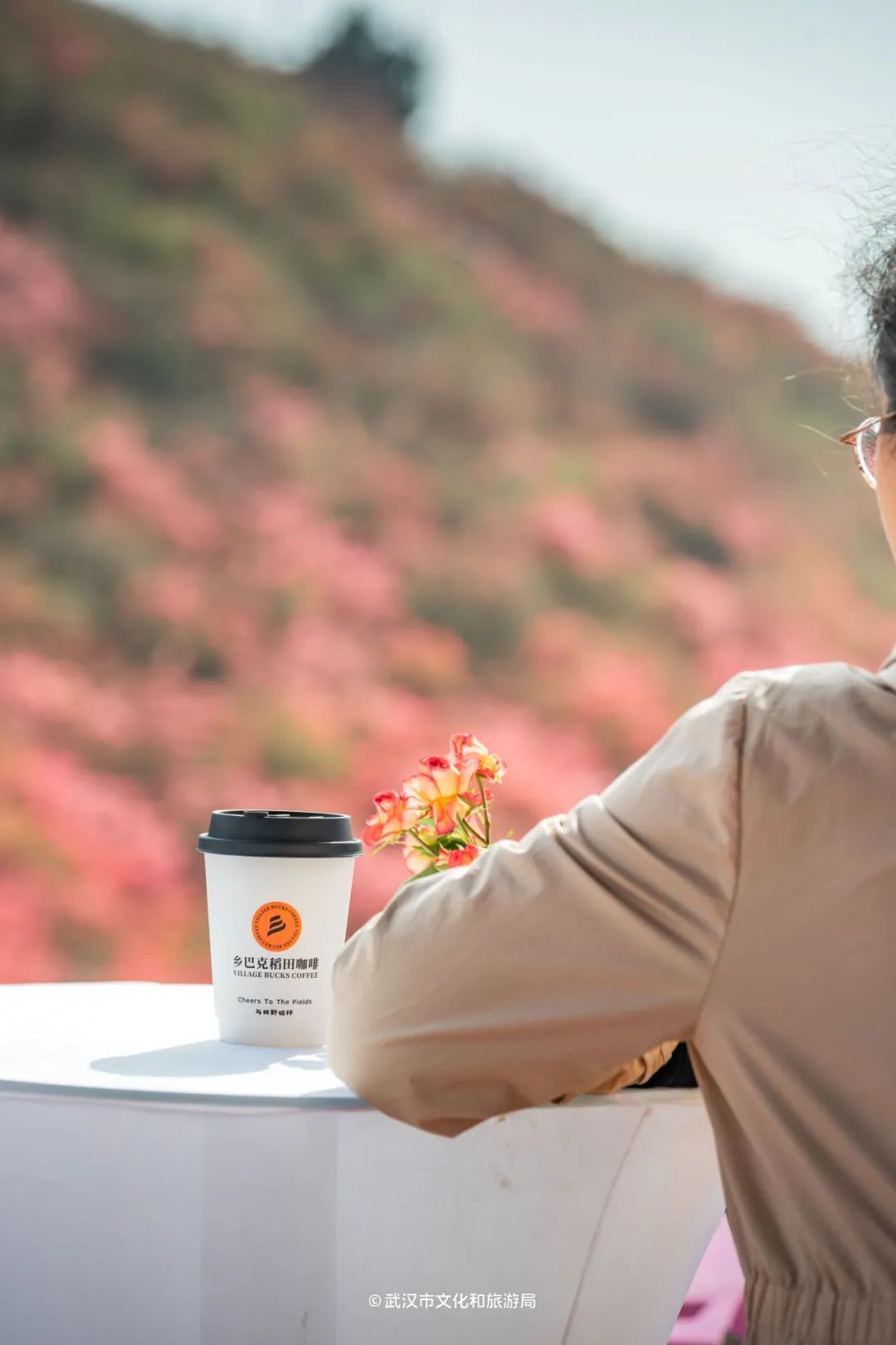 △「花海」山腰处,停着一辆来自内蒙古的咖啡车,摊主之前开咖啡店,后来和爱人一起开着咖啡车环游各地,草原拿铁38元/杯,加了内蒙古特色厚乳,喝起来更丝滑。