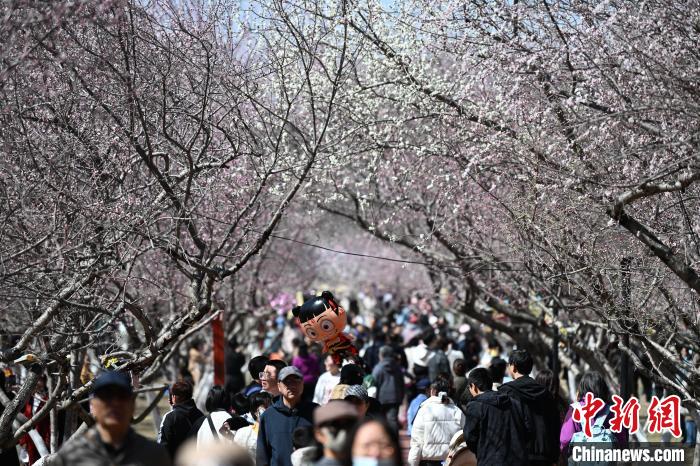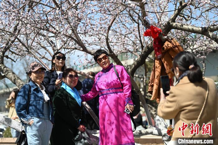 4月5日,内蒙古呼和浩特市,民众观赏桃花。 中新社记者刘文华摄