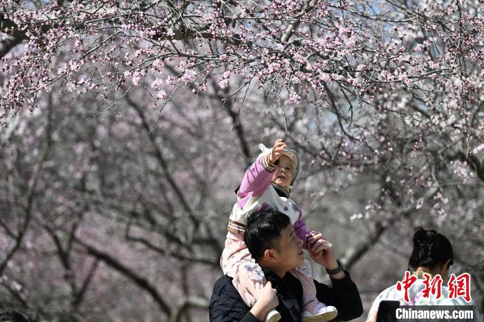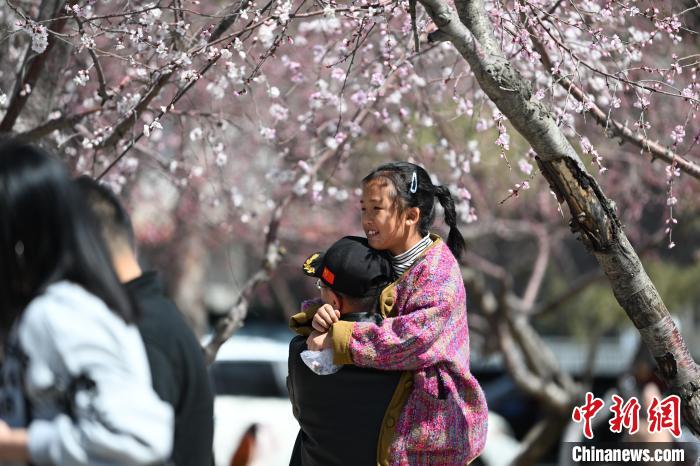 4月5日,内蒙古呼和浩特市,家长抱着小朋友观赏桃花。 中新社记者刘文华摄