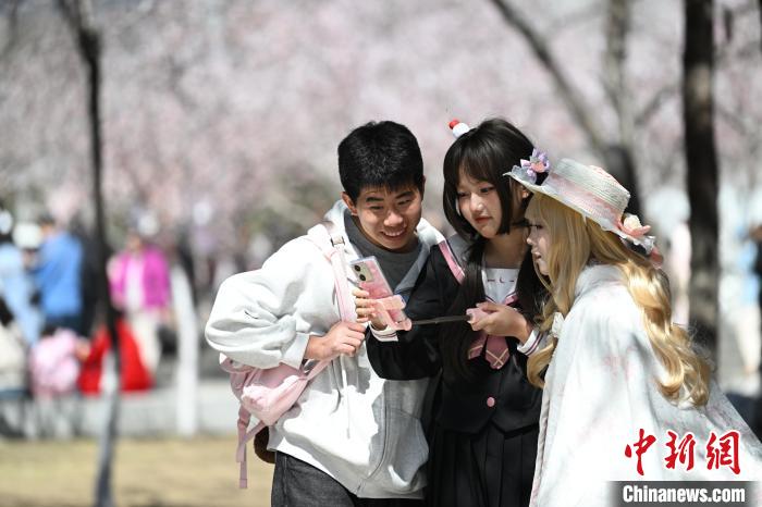 4月5日,内蒙古呼和浩特市,民众在桃树下合影。 中新社记者刘文华摄
