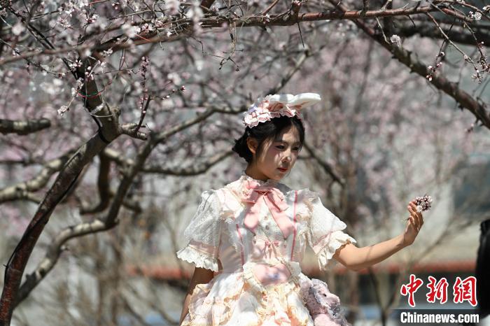 4月5日,内蒙古呼和浩特市,一位女士在桃树下拍照。 中新社记者刘文华摄