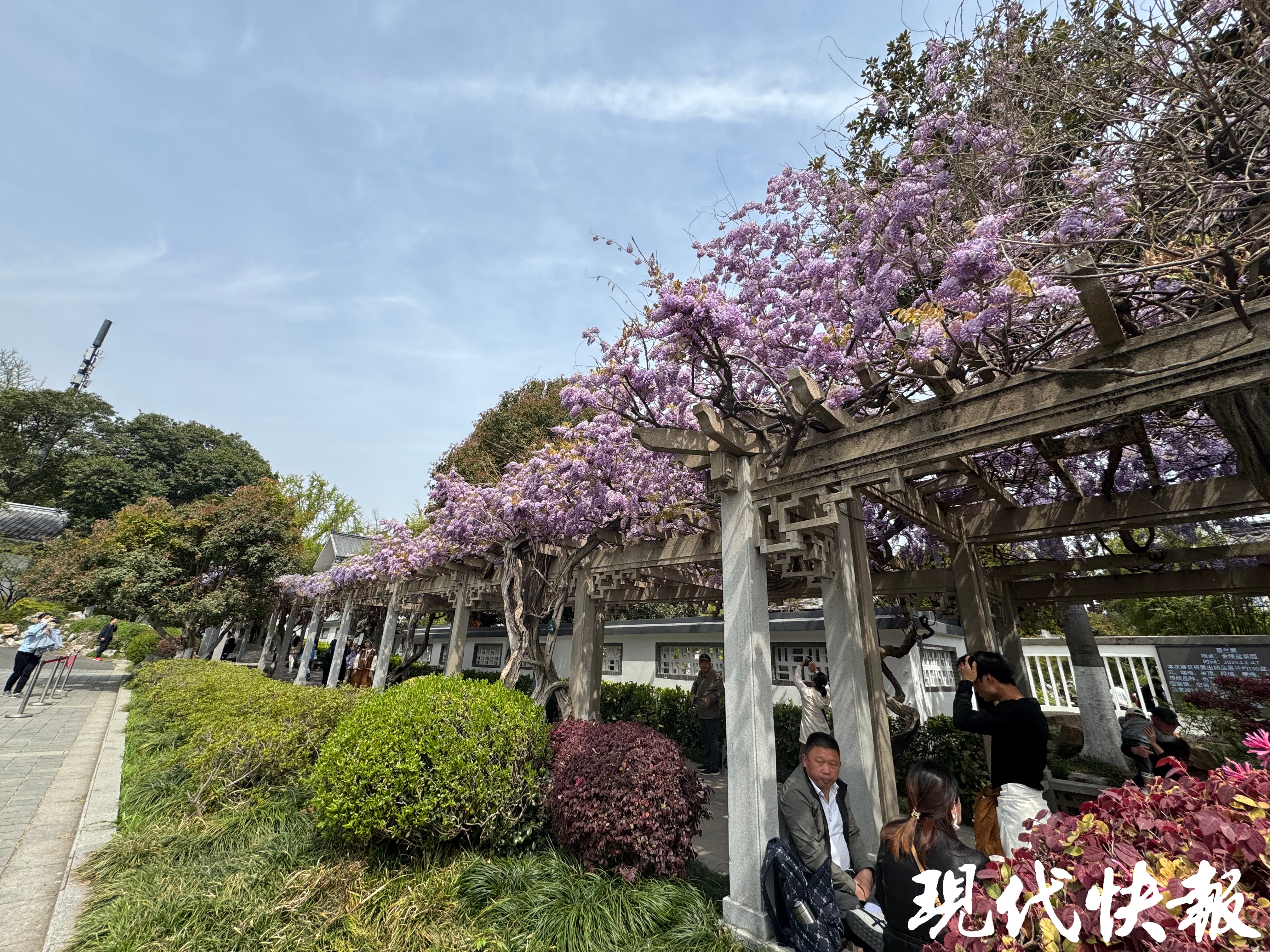 老门东的紫藤花巷上演着“摄影战场”。南京大学生赵佳一大早便带着设备抢占机位:“紫藤花期短,必须和游客潮‘错峰作战’。”而在隔壁小西湖街区,山东游客刘先生一家被木香花墙吸引,孩子手腕上的茉莉花串与花香构成“嗅觉记忆”:“没想到老街区能这么‘年轻’。”
