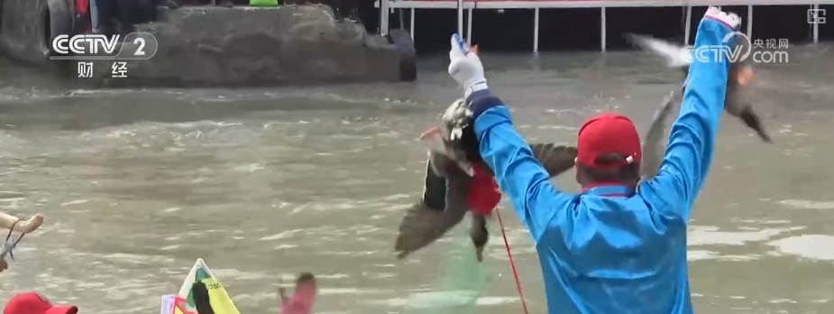 每年的“蚕花水会”众多水上项目是重头戏。2025年,不仅有传统的赛龙舟、踏白船比赛,还新增了水上竞技项目“踏浪抢彩”。来自桐乡洲泉镇8个村的快船队分为4组,两两对决。工作人员将鸭子抛进河道,各村的快船队从桥头出发,瞄准目标,迅速出击。