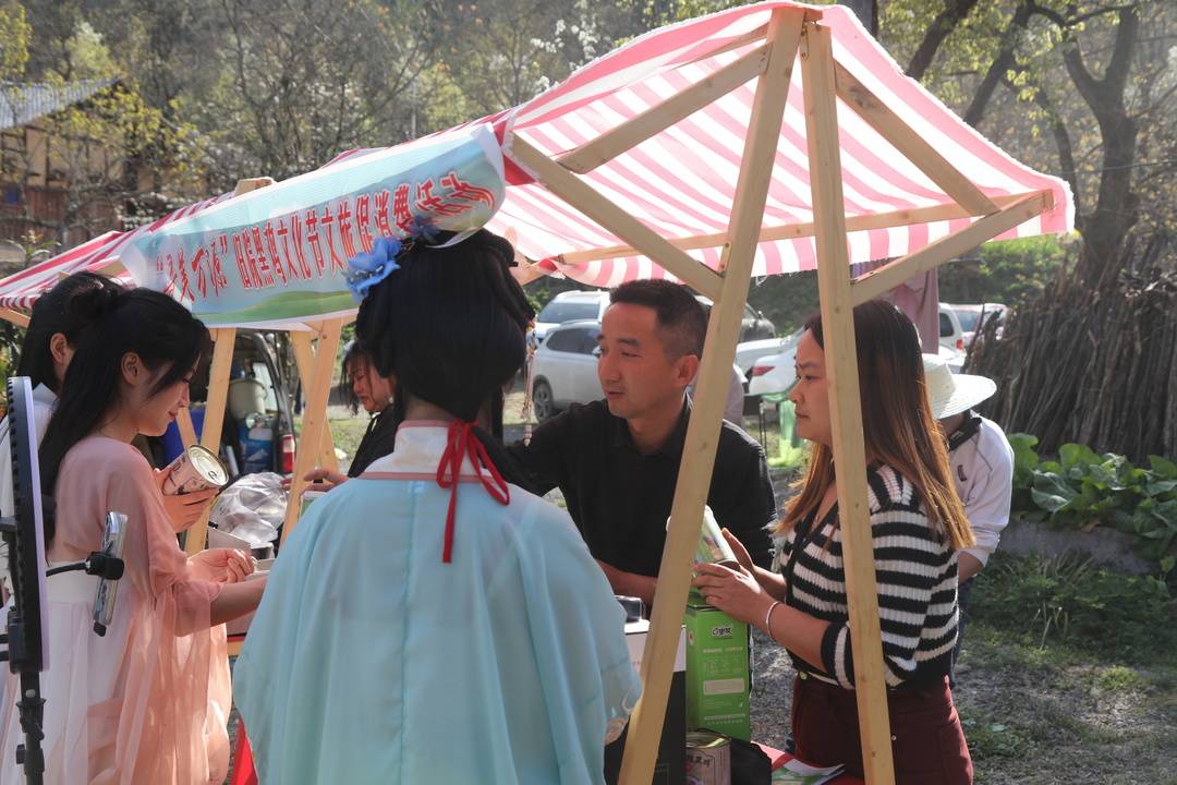 除了赏花、看景,花田里还孕育出了新的消费场景。在“梨花花田集市”上,众多美食汇聚一堂,让游客在赏花、看景之余,也能大饱口福。“寻美万源”旧院黑鸡文化节文旅促消费直播活动也在“梨花花田集市”进行,百里坡旧院黑鸡麻辣鸡块吸引了大量游客前来品尝。