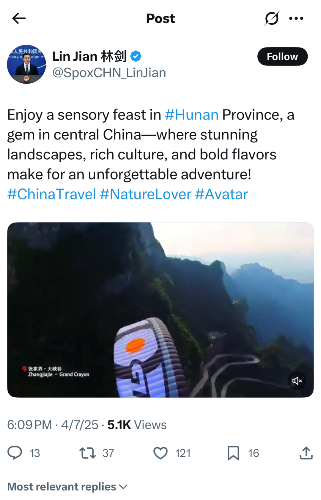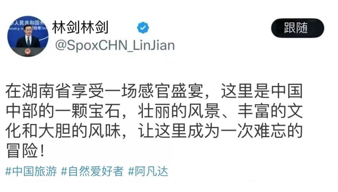 近日,外交部发言人林剑在个人社交媒体上发布了湖南英文宣传片,向全世界推介湖南。