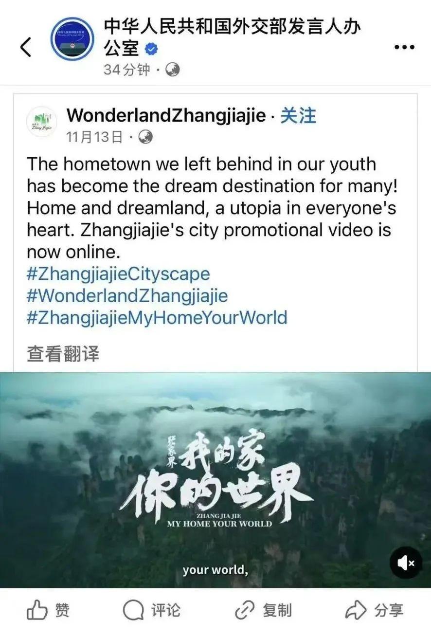 去年12月13日,外交部发言人办公室海外账号转发了张家界城市国际形象宣传片《我的家,你的世界》,并附言:一方家乡,一方梦乡,我们心中的乌托邦。该账号的转发推介使得张家界再次受到全球瞩目。