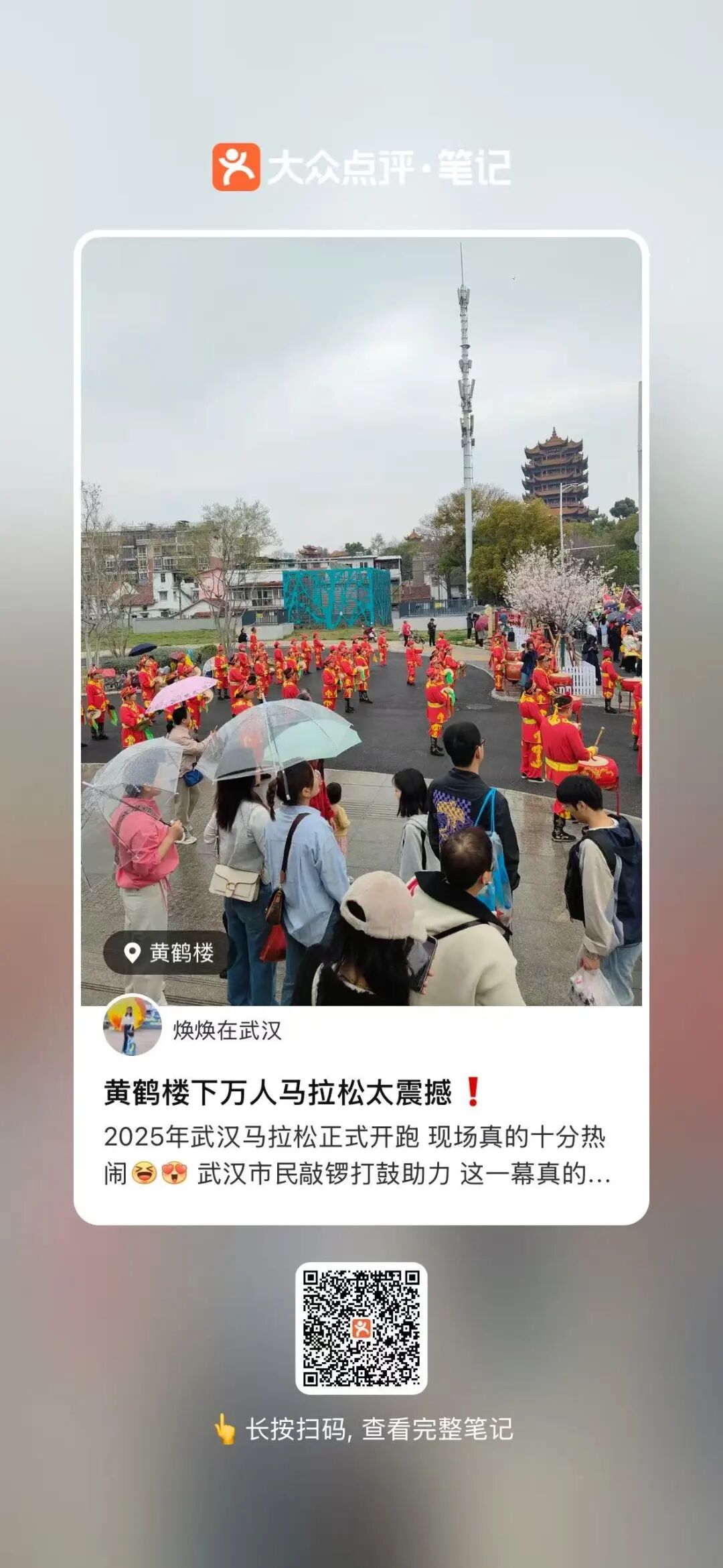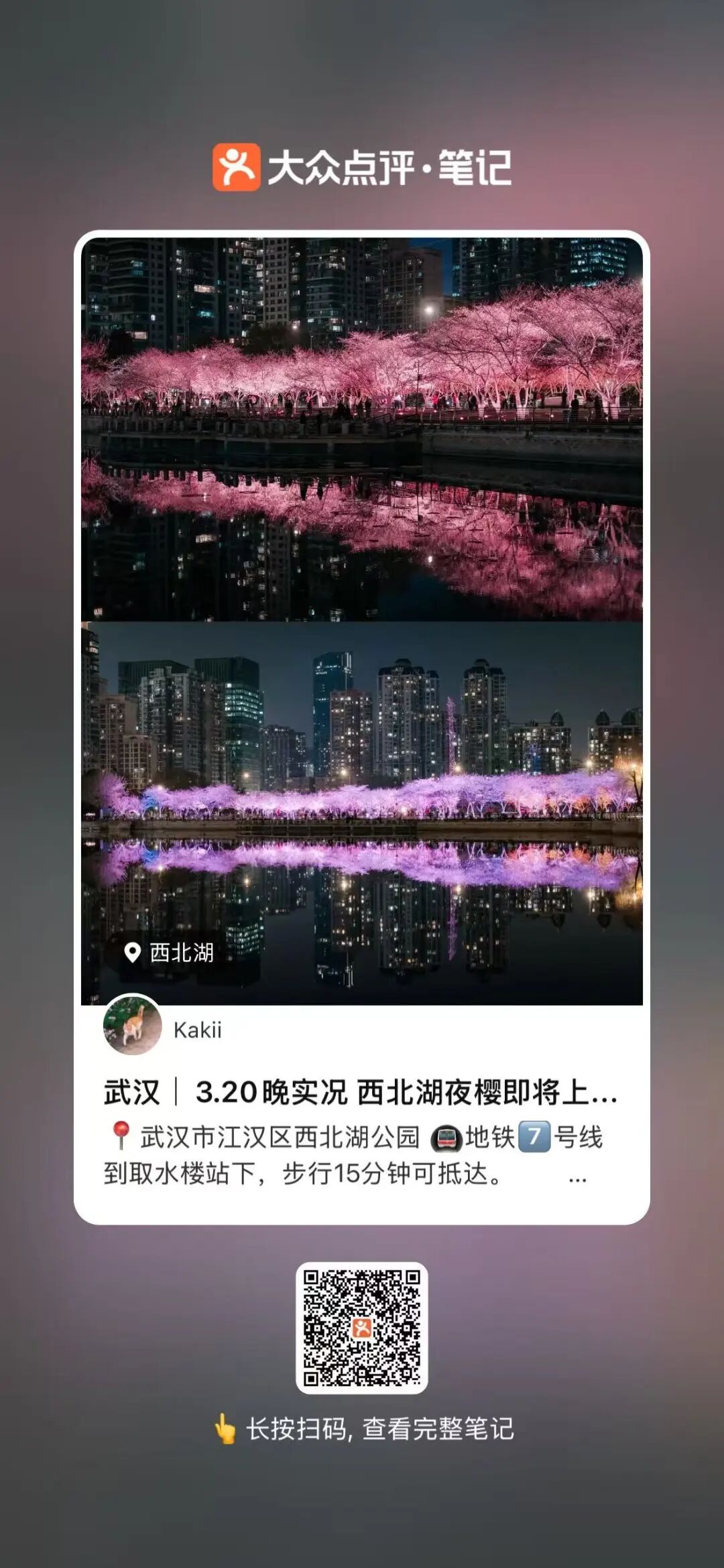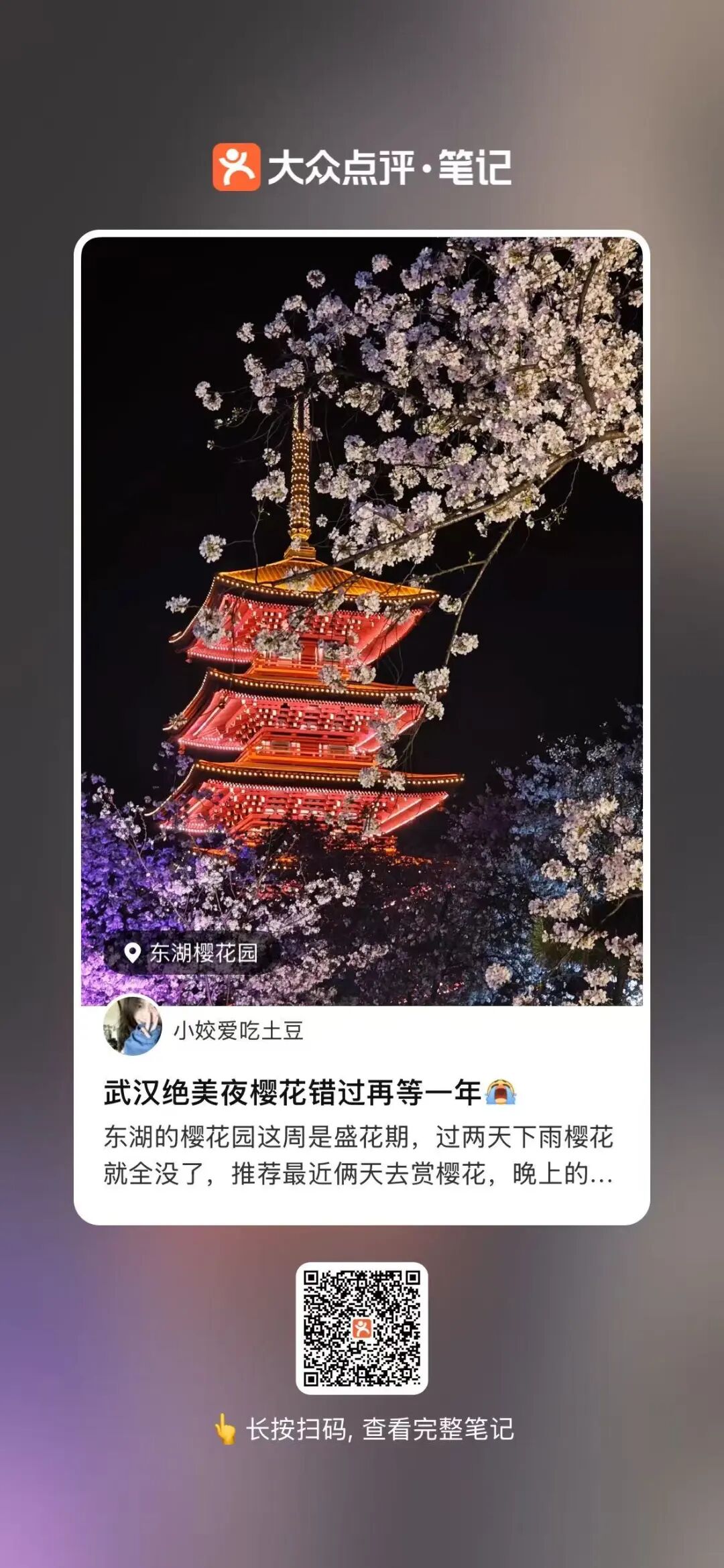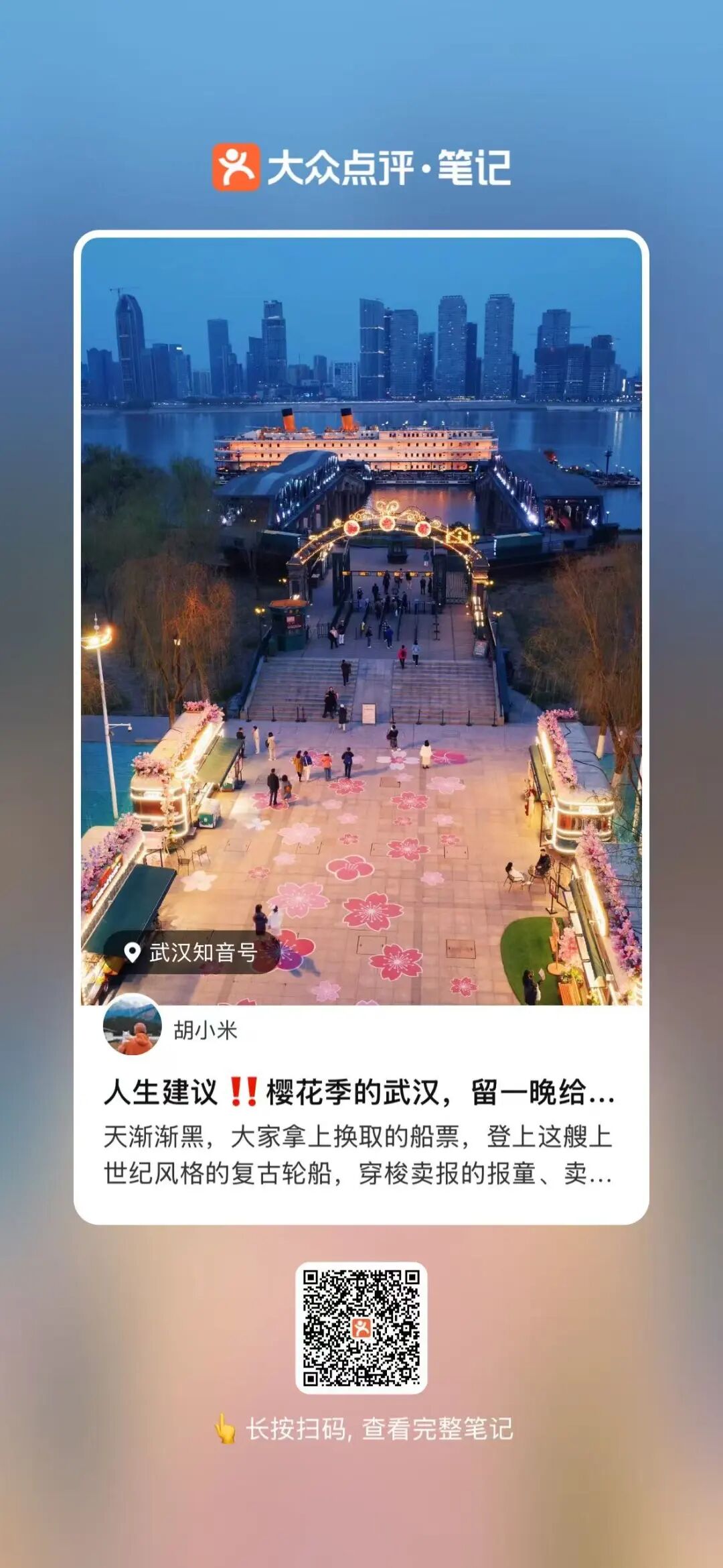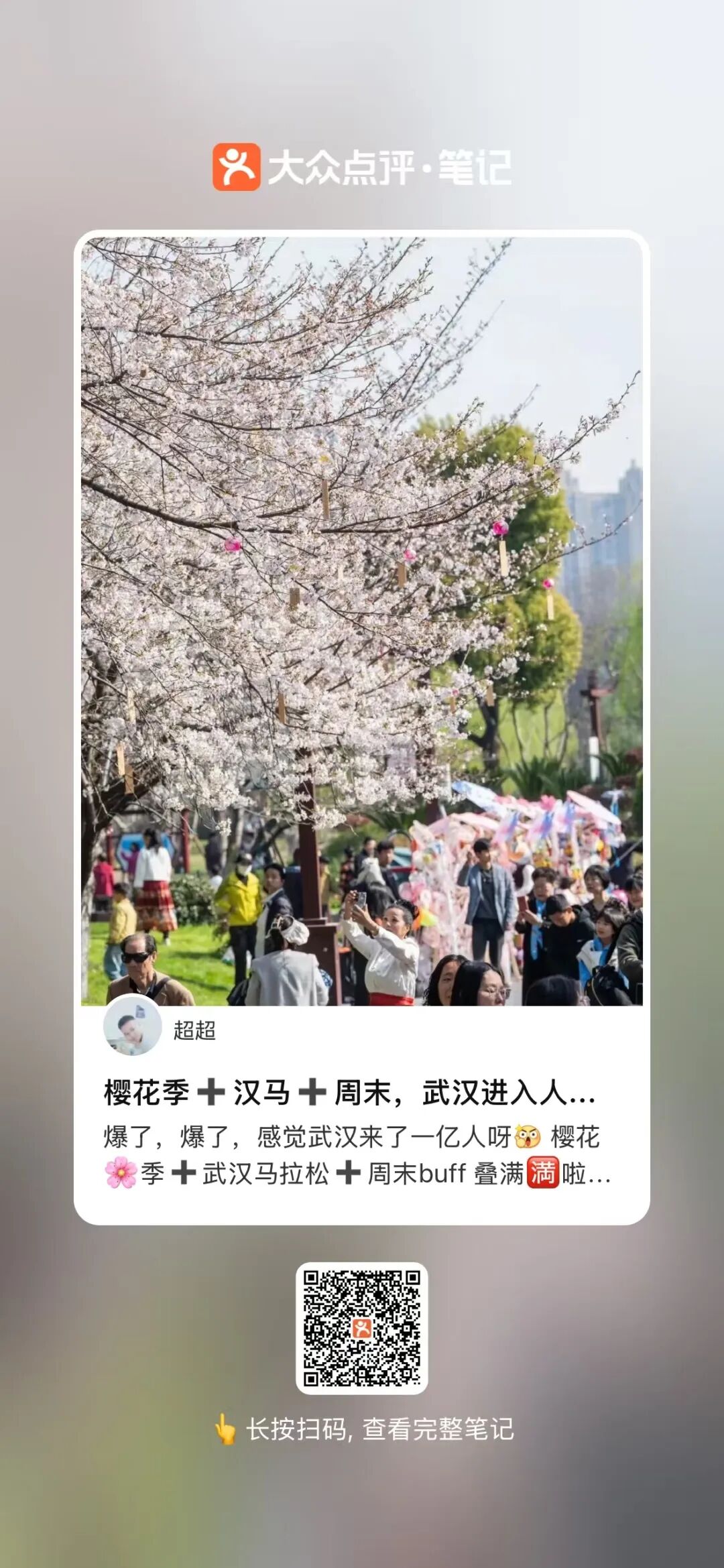 △大众点评笔记近几年,武汉陆续新建了龟山樱花栈道、南岸嘴公园落樱望江、白沙洲江滩公园樱花大道、东西湖樱花溪公园等新晋樱花景点。同时,通过丰富多彩的文、旅、演、体、商等全城资源和配套活动,突出“展形象 促消费”目标,强化全城联动,樱花越来越脱离绿化植物的范畴,越来越成为一种文旅资源。2024年,武汉高调宣布“樱花季正式开启”,并向全球发出邀请,也标志着樱花文旅IP的逐渐成熟。经过持续数十年的种植积累、活动创新与品牌推广,樱花才能成为武汉春日文旅的核心符号之一。