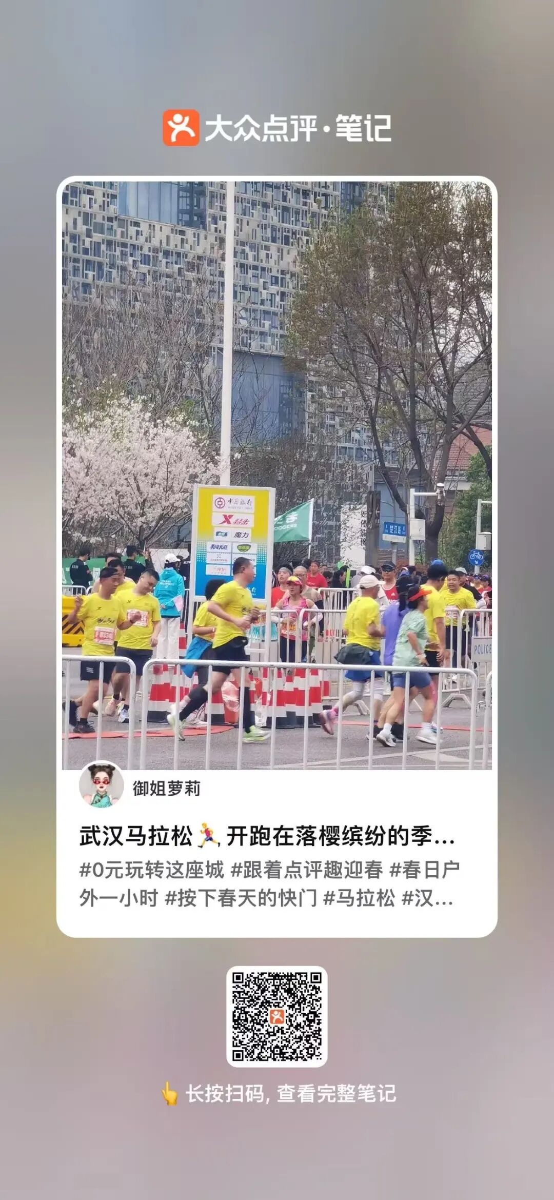 除了汉口江滩、晴川阁、武汉大学、东湖樱花园等几大传统打卡点外,今年在鹦鹉大道龟山至江汉桥一段,道路两侧都栽种了樱花树,龟山上也因地制宜栽种了樱花树,整体串联,勾勒出一条浪漫的春日赛道。“颜值”带来的热度提升显而易见:在大众点评站内,今年“武汉马拉松”相关的笔记热度,相较去年增长了48.2%。