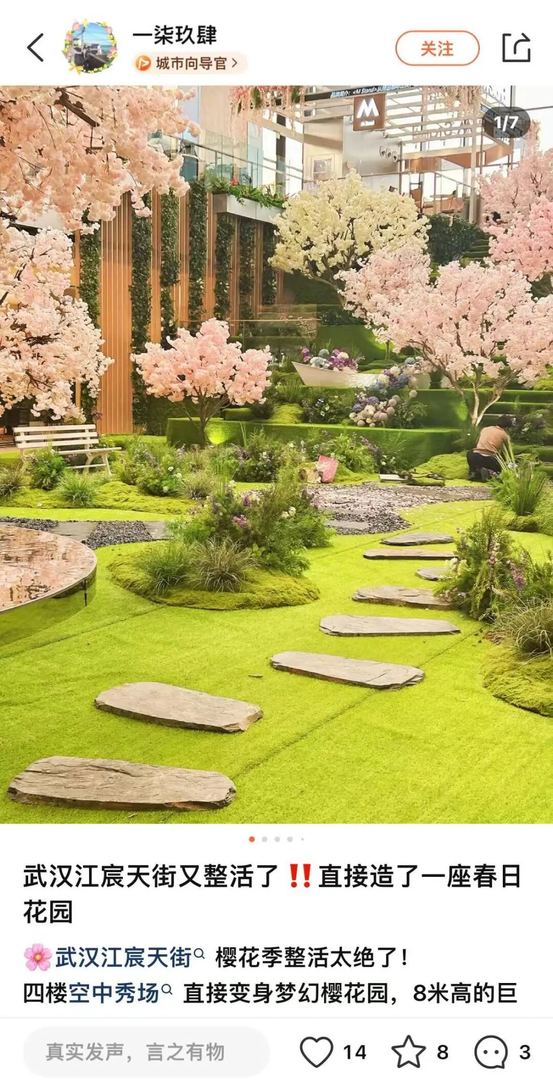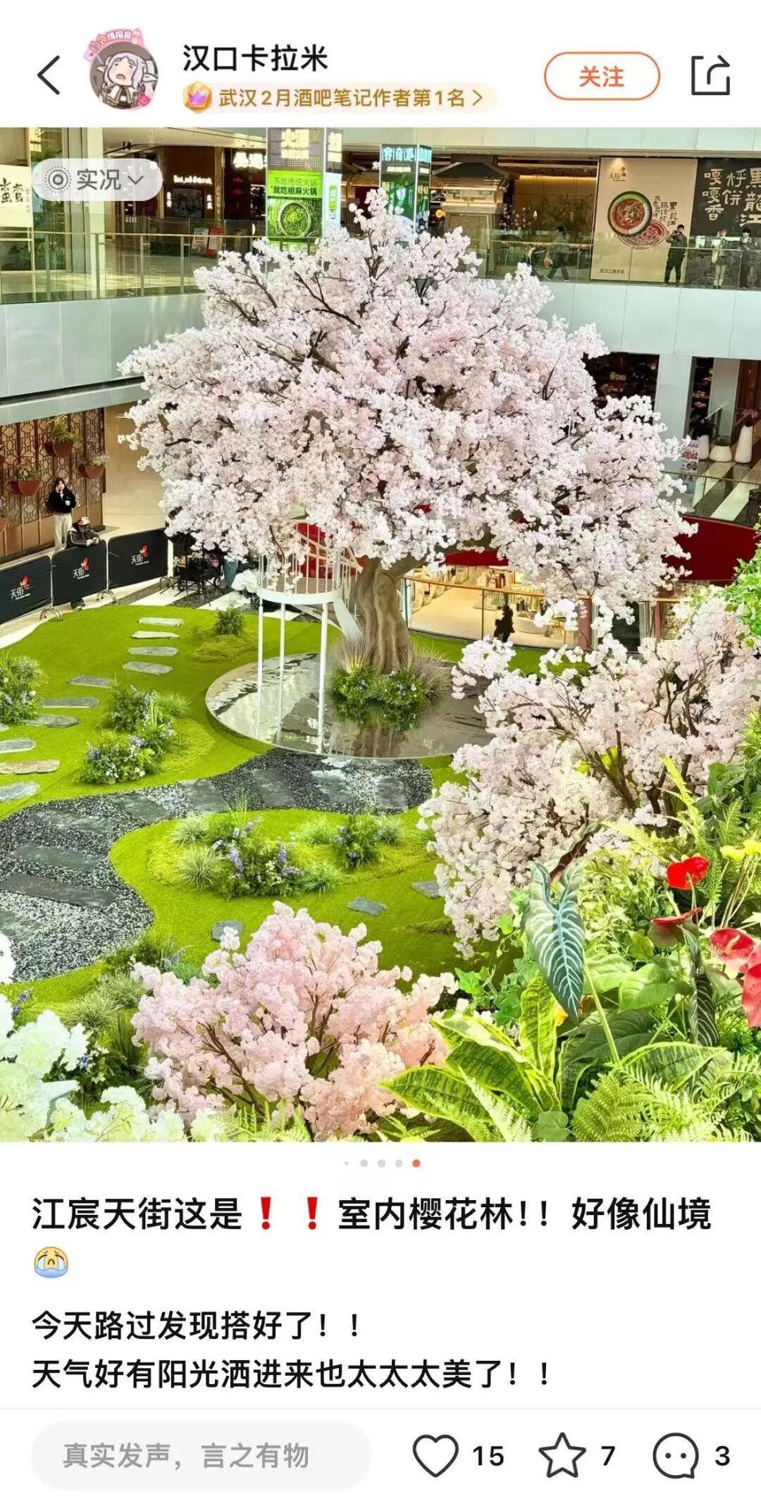 围绕樱花这个武汉春季最大的IP,各大商圈纷纷解锁“樱花消费”新场景:武商集团引种了近千棵樱花树,在武商MALL、武商梦时代、武商城市奥莱的外广场打造樱花大道,并推出打卡、市集、美食、踏青等赏樱特别企划,邀游客和消费者共赏城市美景;江宸天街在四楼空中秀场布置高达8米的樱花树,打造沉浸式樱花场景,定时飘落“樱花雨”,举办国风舞蹈表演、“樱花萌友”萌宠见面会等活动;