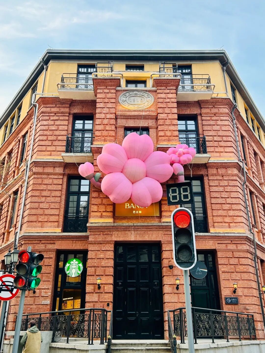 除了赏樱方式的拓展,樱花元素与城中特色街区,也能助力发掘城市历史文化风貌。汉口历史风貌区,在2025央视春晚的火爆之后,借助樱花主题citywalk,打造一个个武汉城市打卡点,又一次点燃社交网络,为城市发展注入新鲜脉动。巴公房子、民众乐园等经典历史建筑外,均增设巨型樱花主题气模装置,沿着一路粉色樱花打卡点,走过汉口江滩、同兴里、江汉路等来武汉必逛街区,一路生花,樱动江城。