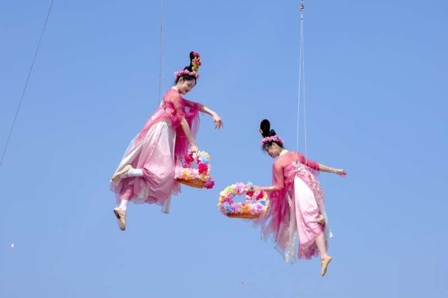 由演员扮演的“天女”正在低空飞行,手持花篮洒下缤纷花雨,与游客脚下片片桃花彩绘地贴交相辉映。今年桃花节,游客也能体验“低空飞行”。平谷区依托通航产业资源优势,落实国家低空经济发展战略,在石佛寺机场推出平谷丫髻山,河北兴隆青松岭、天津蓟州盘山等多个低空飞行体验场景,游客不仅能够体验空中飞行的乐趣,更能以“上帝视角”尽览花海的绚烂、燕山的雄浑、长城的沧桑。