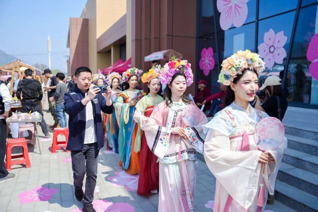 中青报·中青网记者在开幕式现场看到,多名青年身着汉服、头顶簪花穿梭在会场中;10匹装饰马匹列队游行,穿越桃花林,让游客沉浸在浓厚的传统文化氛围中。今年的桃花节期间,平谷将为游客打造“花神绮梦-主题巡游”沉浸式体验。邀请演员扮演“桃花仙子”“刘备”“关羽”“张飞”“陶渊明”“唐伯虎”等角色,轮流讲述与桃花的故事。