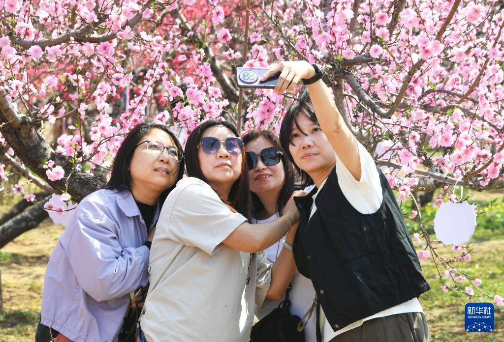4月10日,市民在北京市平谷区大华山镇桃花海赏花拍照。新华社记者任超摄