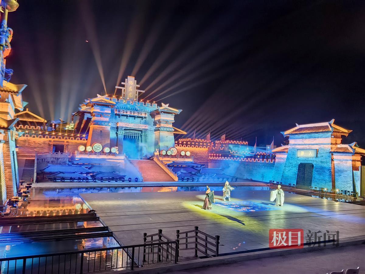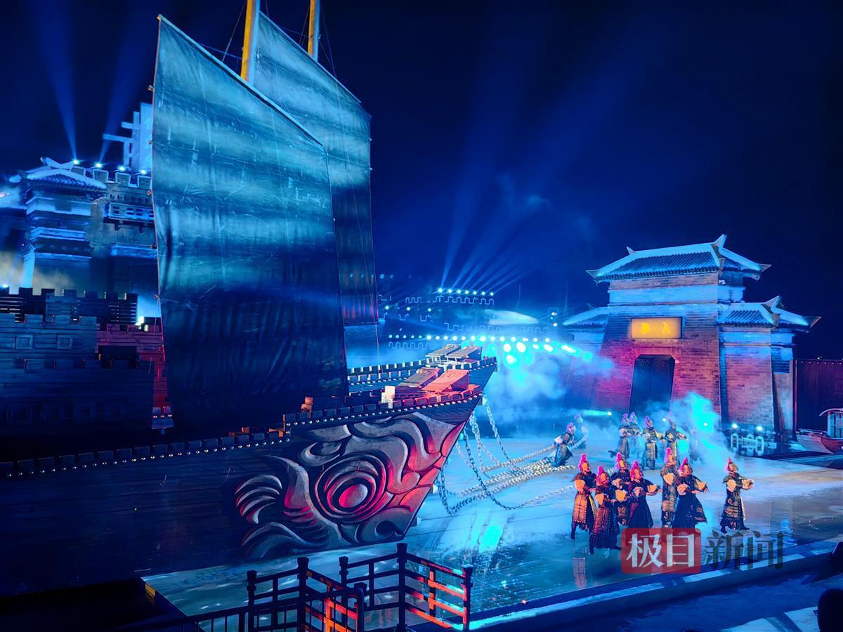 作为长江经济带重要文旅地标,三国赤壁古战场迎来创意新生。首演剧目《赤壁借东风》突破传统观演模式,以“说书人”串联“空城计”“草船借箭”等经典典故,运用全息投影、数字灯光等现代剧场技术打造沉浸空间。现场特别设置千面脚盆鼓互动装置,观众化身“三国战士”击鼓借风,声光联动形成震撼的战场音画,开创了全国首个观众深度参与的战争场景实景演艺。