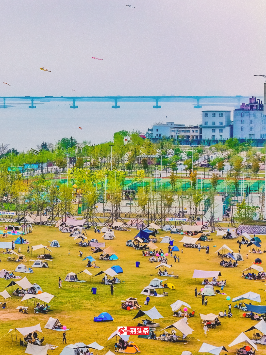 市民在沙市码头柳林洲段公园露营休闲