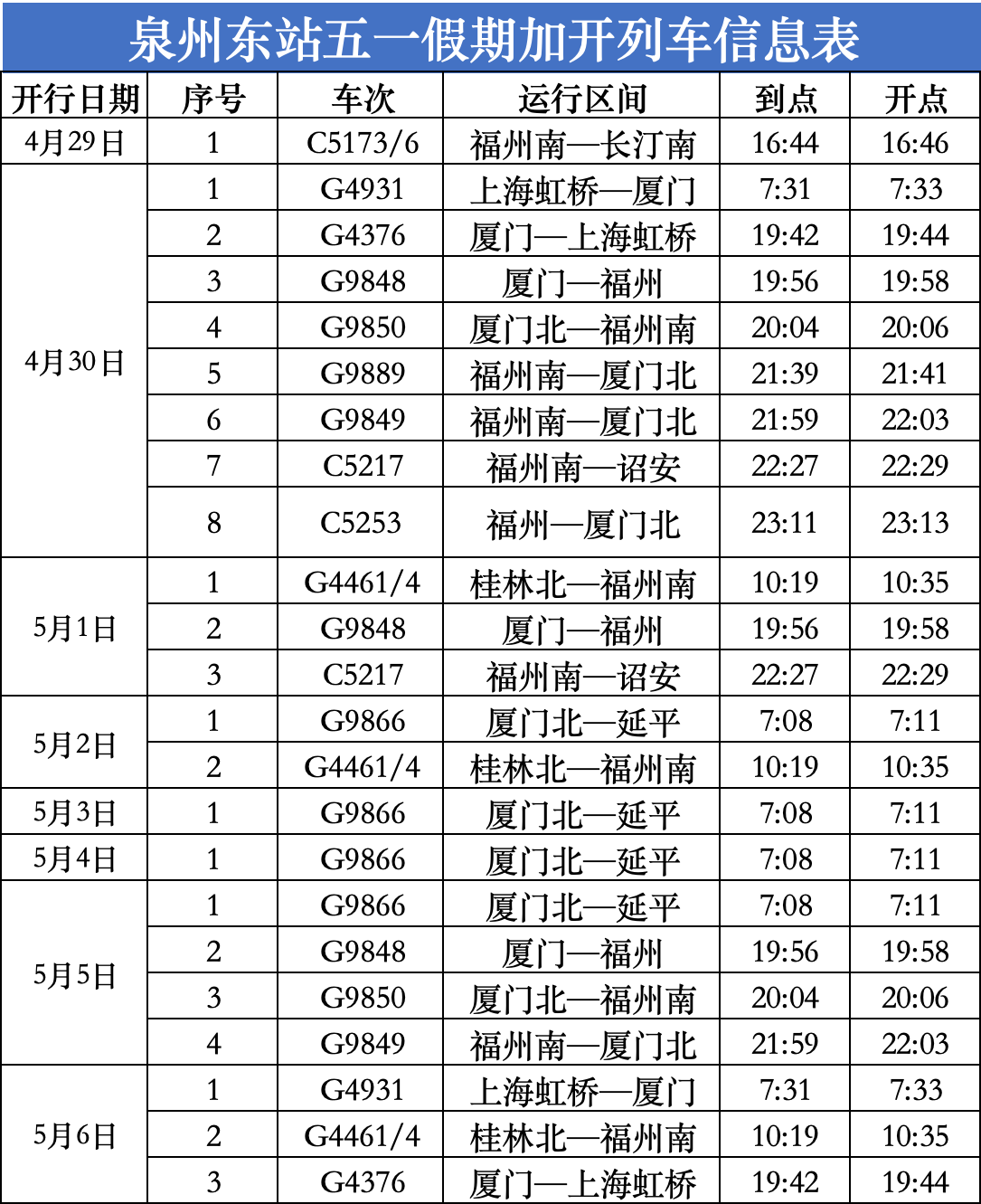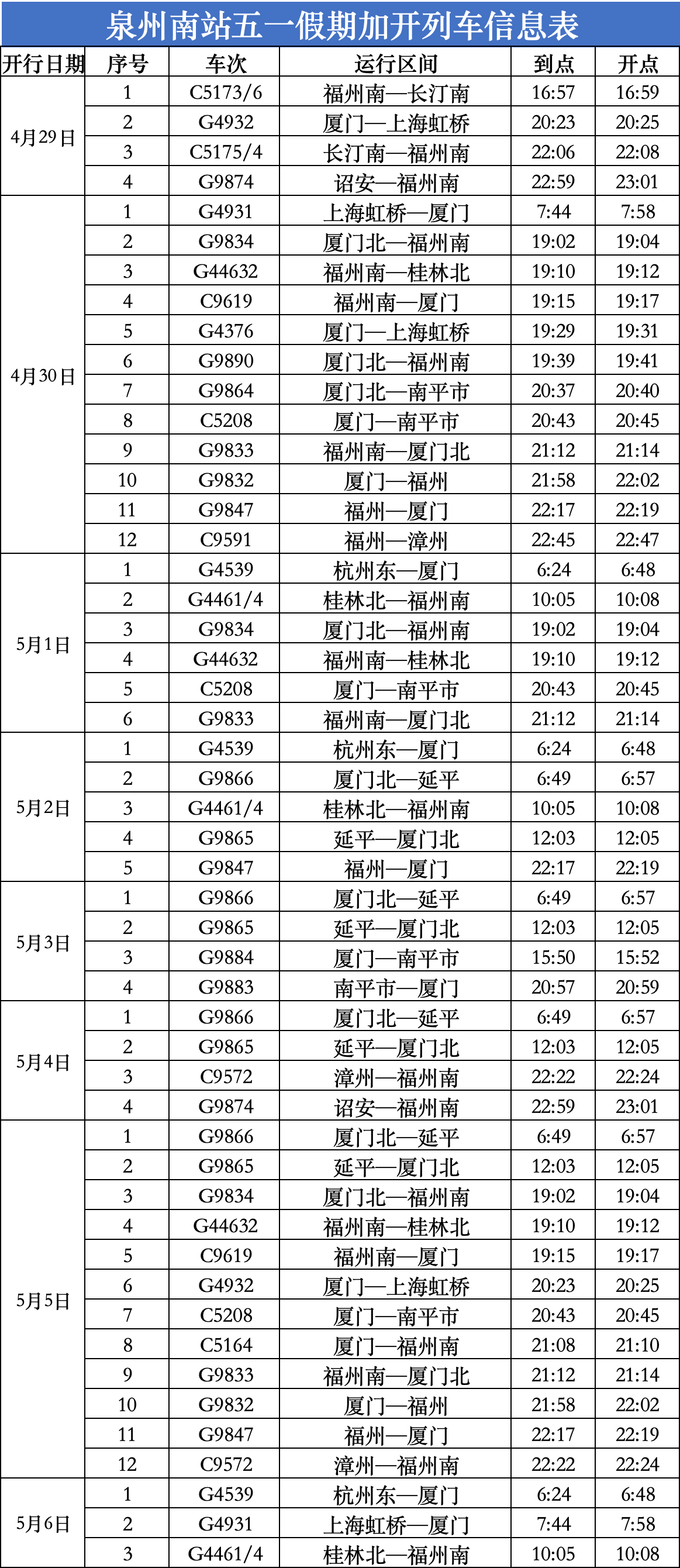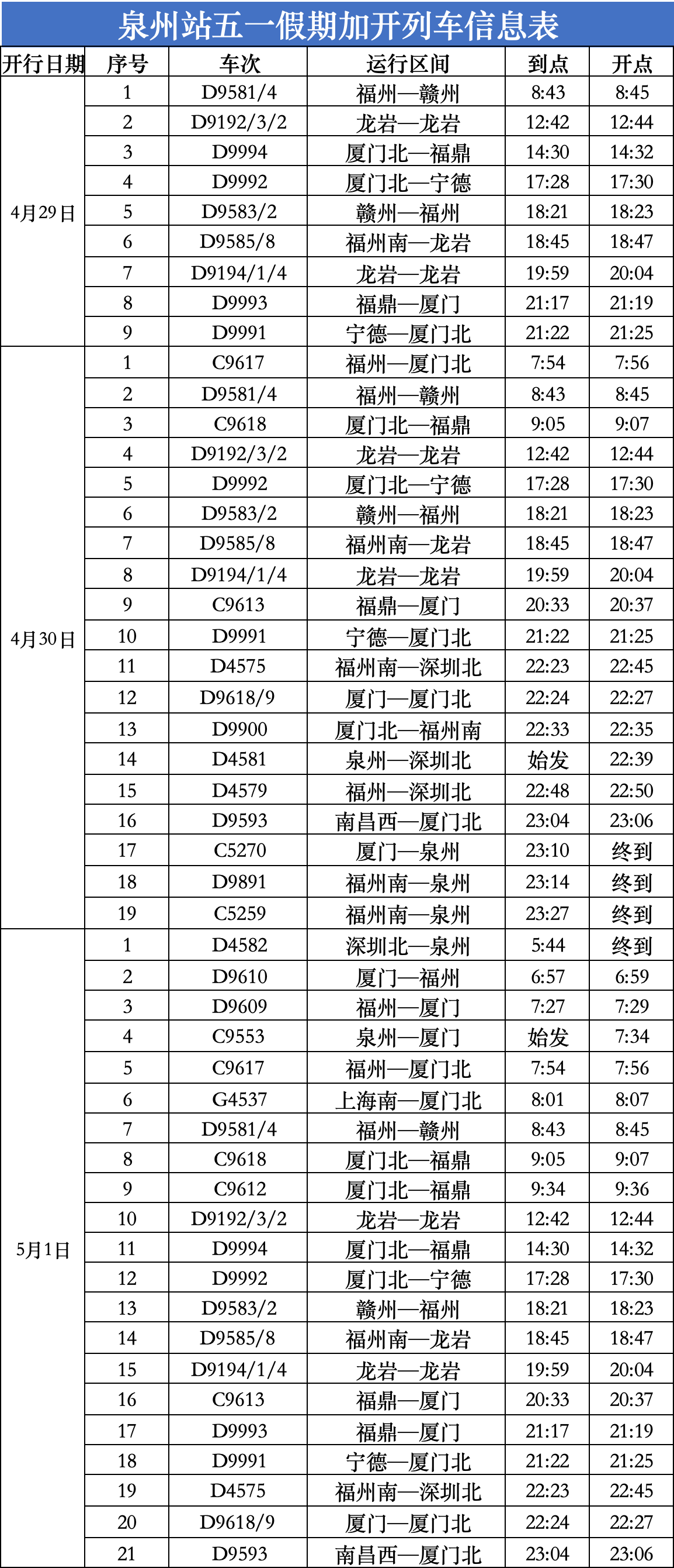 其中,泉州、晋江等车站增开往返深圳北、福州、厦门方向的旅客列车36列;泉州站在4月30日、5月5日的假期客流高峰时段特别增开了22时39分去往深圳北方向的始发夜间动车组列车,并将当日末班列车到站时间延长至0时11分,将当日首趟到站列车时间提早至5时44分,全力满足旅客“五一”假期出行及返程需求;泉州南、泉州东站固定增开去往南平、上海、桂林等方向的高铁和城际列车,进一步帮助旅客在假期乘坐福厦高铁实现“快旅慢游”。