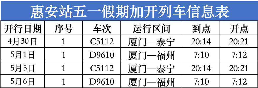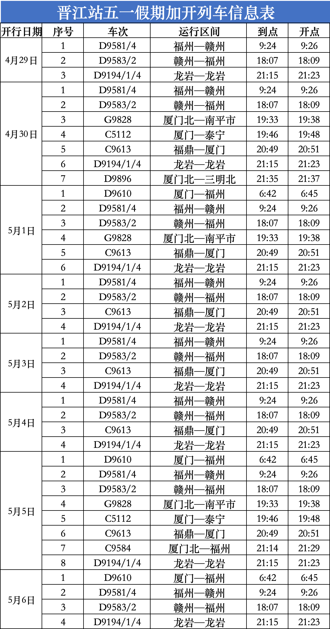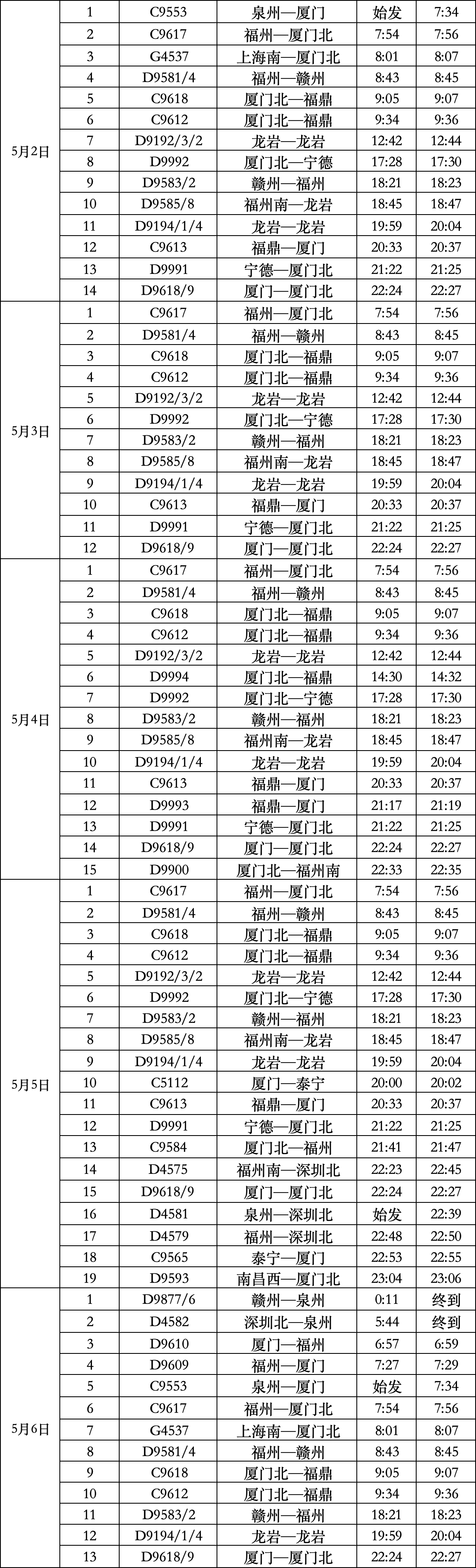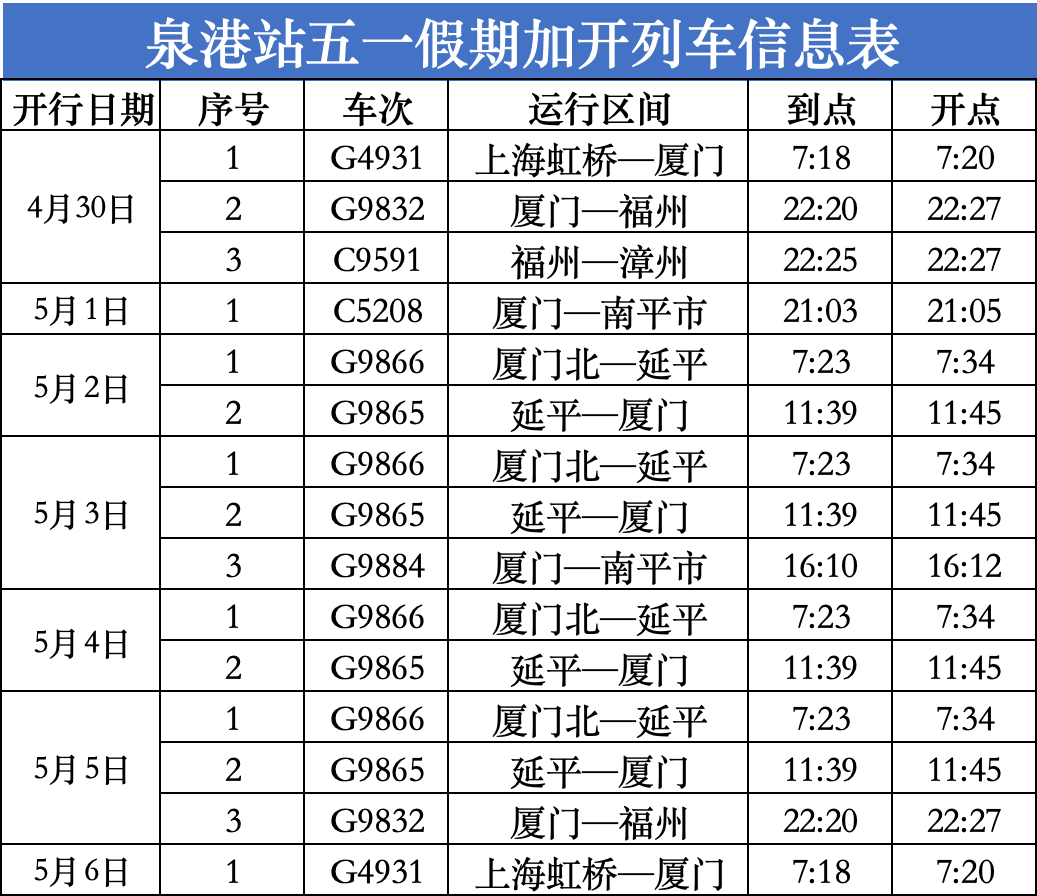 其中,泉州、晋江等车站增开往返深圳北、福州、厦门方向的旅客列车36列;泉州站在4月30日、5月5日的假期客流高峰时段特别增开了22时39分去往深圳北方向的始发夜间动车组列车,并将当日末班列车到站时间延长至0时11分,将当日首趟到站列车时间提早至5时44分,全力满足旅客“五一”假期出行及返程需求;泉州南、泉州东站固定增开去往南平、上海、桂林等方向的高铁和城际列车,进一步帮助旅客在假期乘坐福厦高铁实现“快旅慢游”。