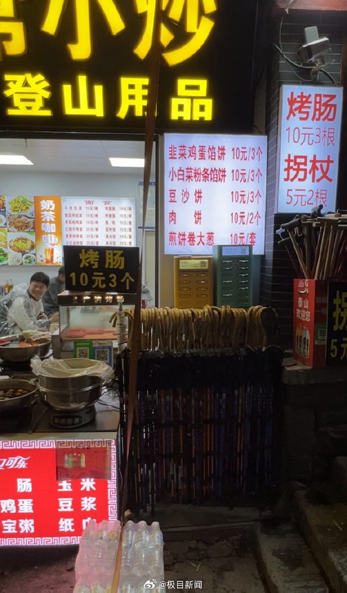 “10元3根烤肠、10元3个馅饼、2元一瓶的矿泉水,5元2根的登山拐杖,泡面6元……”有商家的扩音器循环播放着自家售卖的餐食及商品,极目新闻记者看到,各家门店的餐食价格较为实惠,与景区外的商家价格基本无异。其中,一碗肉丝面的价格12元,馅饼也是现包现做。
