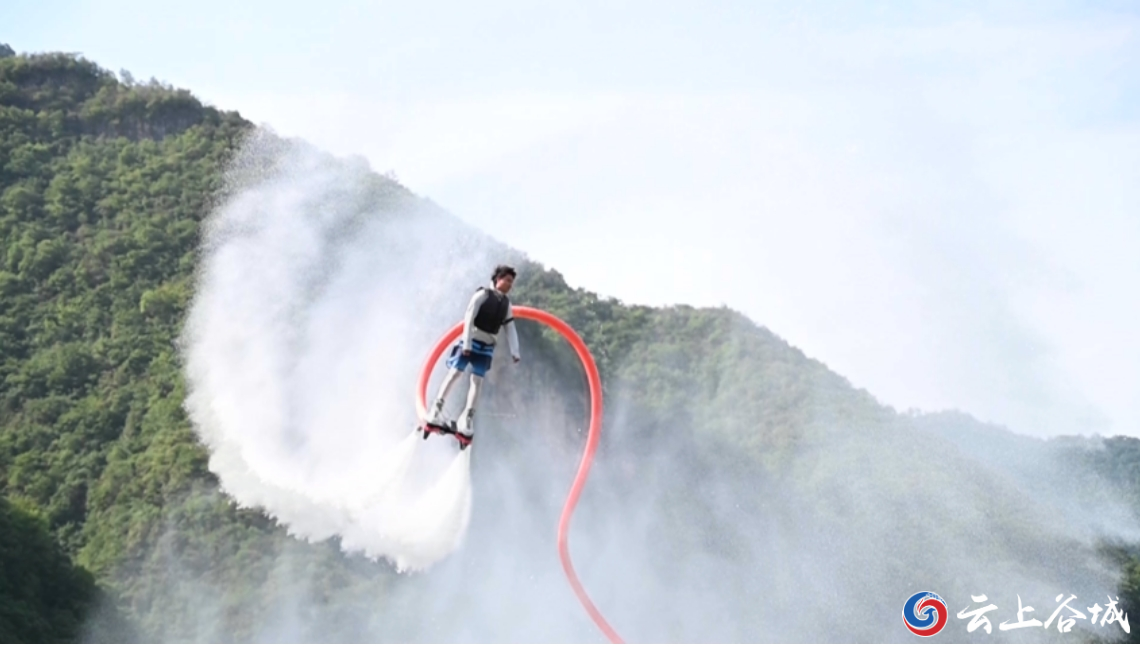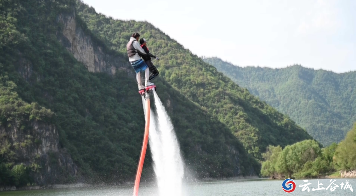 在一片开阔的水面上,游客在专业教练的保护下,从水面腾空而起,飞到将近20米的高空。伴随着喷水装置的反冲动力,专业教练带着游客完成水上漫步、高空翻腾等高难度动作,极具刺激性和观赏性的画面,引得岸上游客一阵惊叫和喝彩。在南河小三峡景区龙滩码头,景区新推出的水上游乐项目引来游客连连叫好。