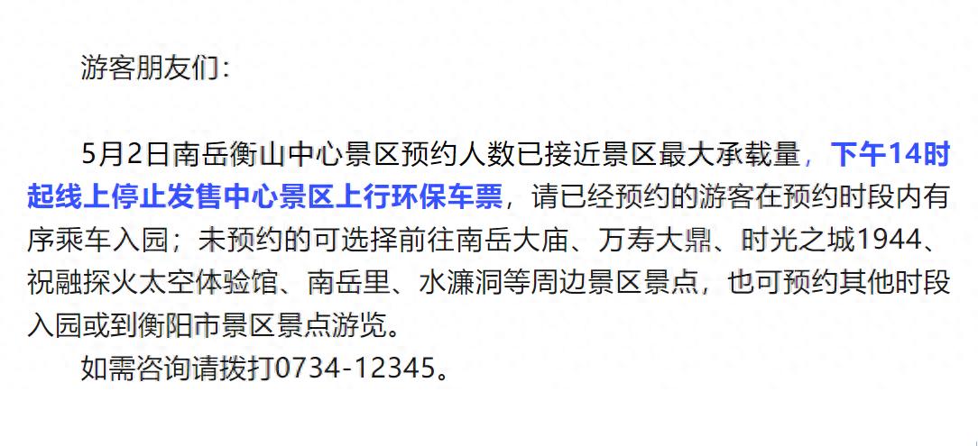 5月2日,据南岳衡山中心景区官方消息,预约人数已接近景区最大承载量,下午14时起线上停止发售中心景区上行环保车票,请已经预约的游客在预约时段内有序乘车入园;