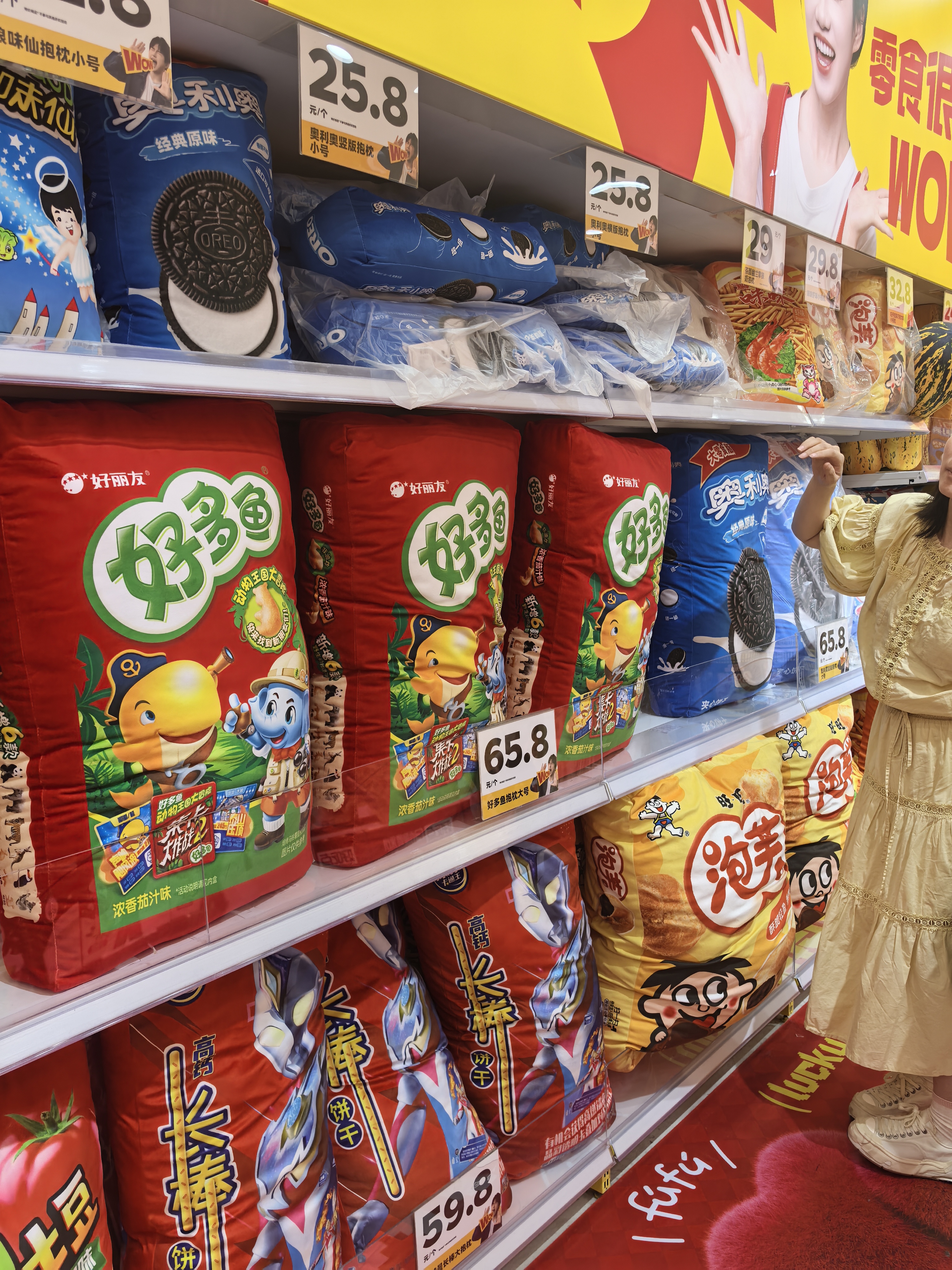 盖“被子”的超大双仔辣片、需要“扛”回家的超级奥利奥、可以抱起来“嗦”的方便面......走进店内,仿佛置身“巨人国”,各类零食超大包装极具创意和视觉冲击。记者在门店走访时发现,大零食成了不少游客的拍照搭子,捧起比脸还大的果冻,将一米长的“金箍棒”扛在肩头,游客们摆出各种好玩的拍照姿势。