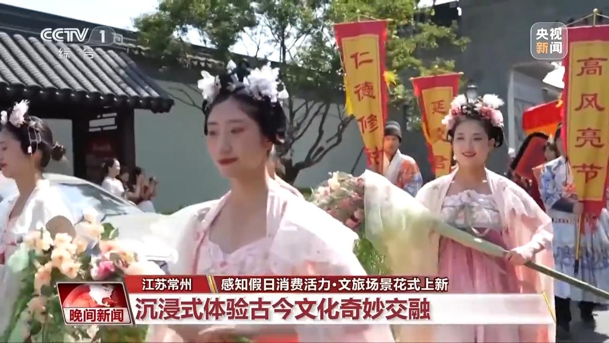 让游客沉浸式体验古今文化的奇妙交融,打造多元消费场景,也是今年五一假期文化旅游的一大特点。在江苏常州的舜山小镇景区,这里的国风巡游吸引了不少年轻人,游客也可以穿上自己喜爱的汉服,梳好发髻,加入巡游队伍。人们载歌载舞,行进在青砖黛瓦的街巷。