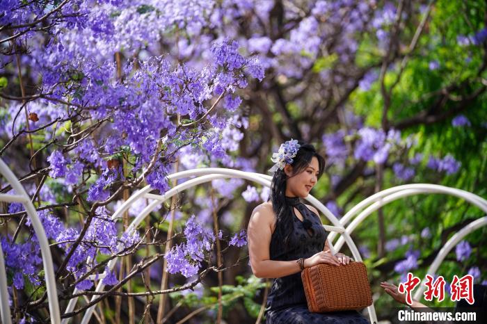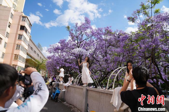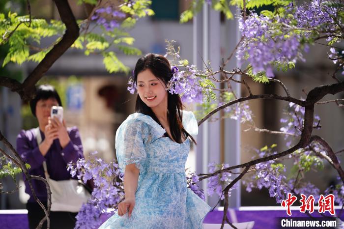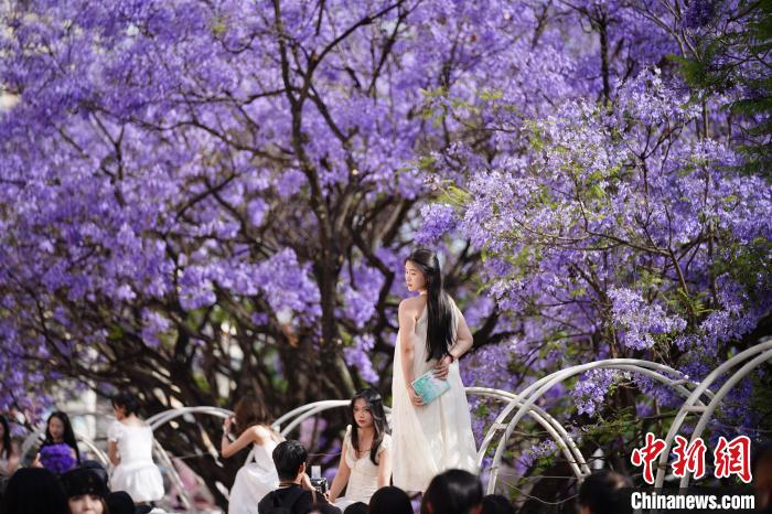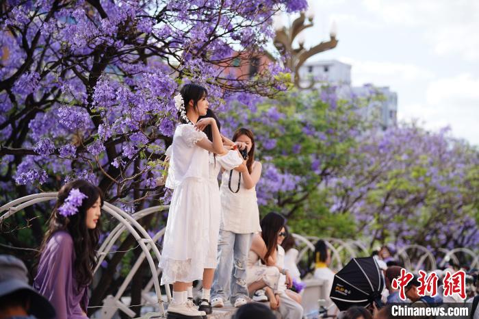 5月4日,紫色花海吸引游客。“五一”期间,昆明市的蓝花楹正值最佳观赏期,吸引众多市民和游客前来打卡拍照,共赴浪漫花约。 中新社记者刘冉阳摄