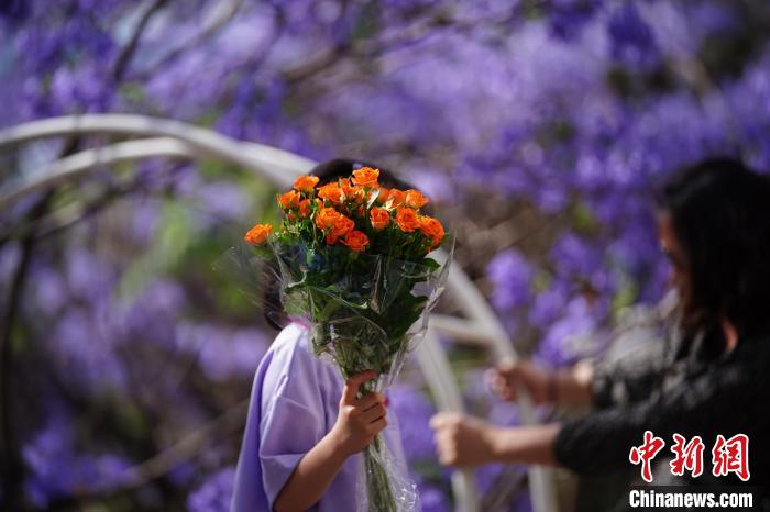 5月4日,一名小女孩手捧花束在蓝花楹树下拍照。“五一”期间,昆明市的蓝花楹正值最佳观赏期,吸引众多市民和游客前来打卡拍照,共赴浪漫花约。 中新社记者刘冉阳摄