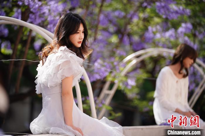 5月4日,蓝花楹树下拍照的女孩。“五一”期间,昆明市的蓝花楹正值最佳观赏期,吸引众多市民和游客前来打卡拍照,共赴浪漫花约。 中新社记者刘冉阳摄